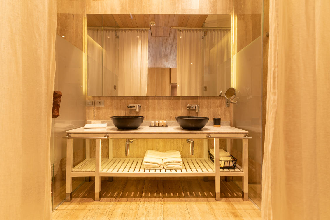 It takes place in a space that has two rooms, the foyer welcomes you to the living room where you are greeted by a rest area with designer furniture and a dining room where you can enjoy our gastronomy. In addition, it has a personalized bar that reveals a black marble/quartz countertop wrapped in black wood cabinets that highlight a cellar with a select variety of Chilean wines. On the other hand, there is the space of the room that reveals luxury details, design and textures to guarantee the best comfort for our guests. This area features a bathtub that offers guests a unique alternative to relaxation. The bathroom, covered in travertine marble on its walls and floors, is located in a large space, with high ceilings and handmade ceramic details. The bathroom has a standing shower and separate toilet area. It also has an audio system, Smart TV, integrated temperature control, courtesy local calls, a selection of magazines and high-speed Wi-Fi.