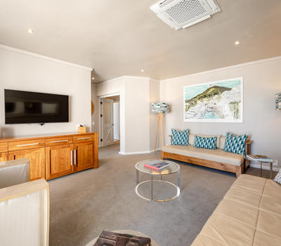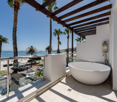 Spacious interior with dining area, lounge, and views of the beach, sea and Lion's Head. Features a balcony with romantic outdoor bath