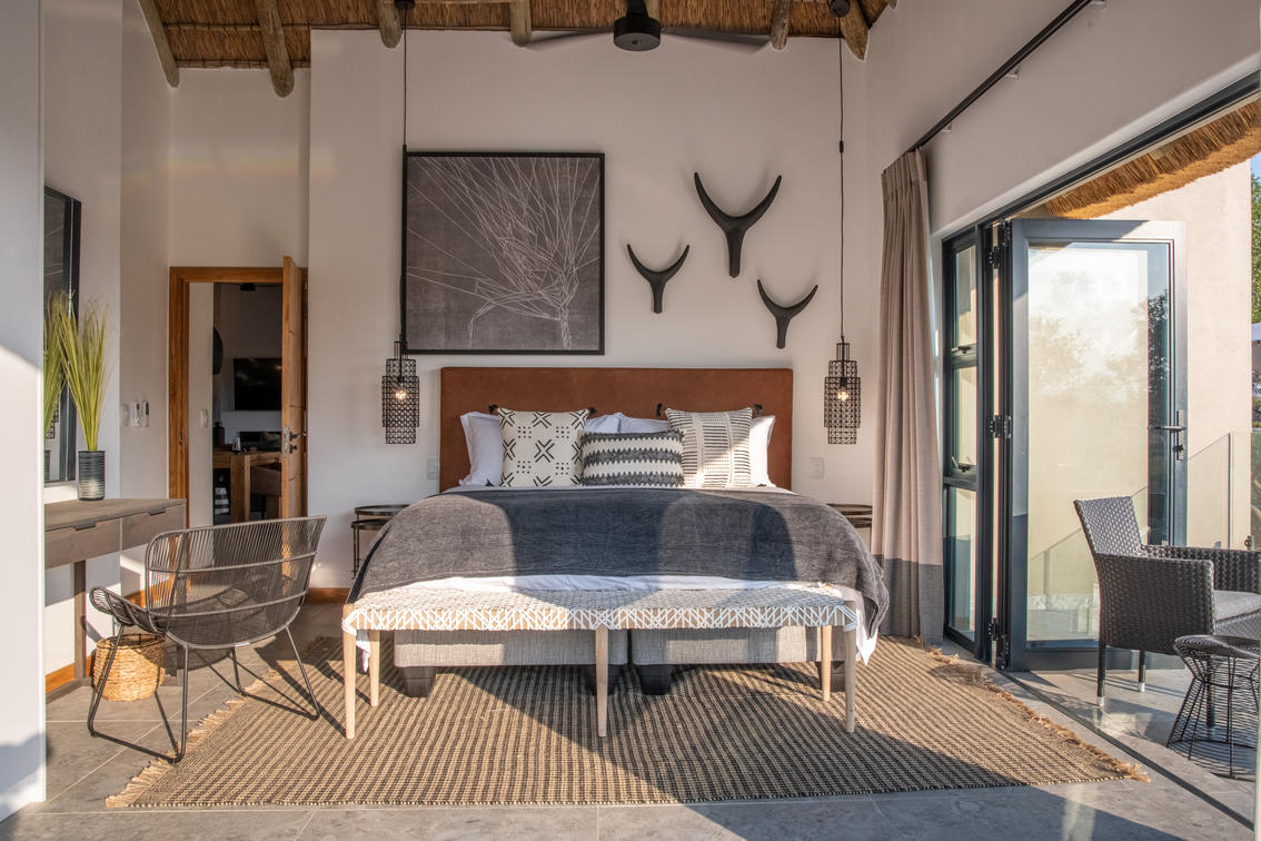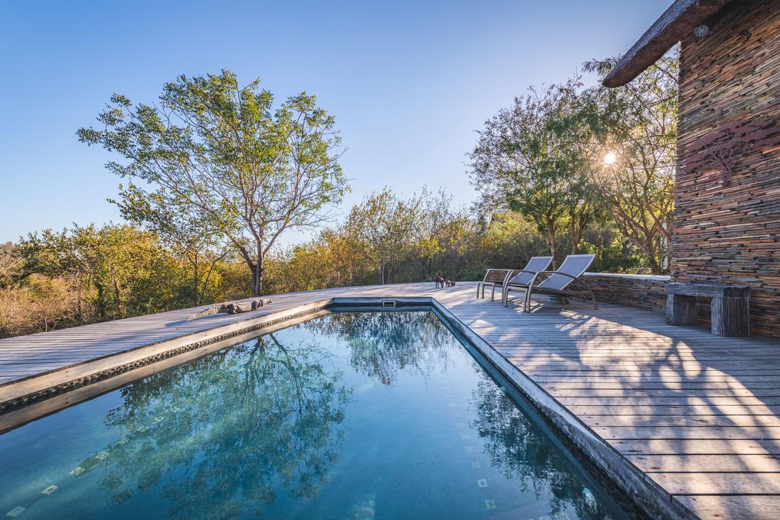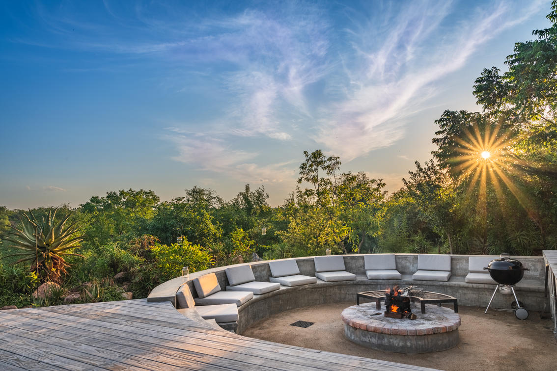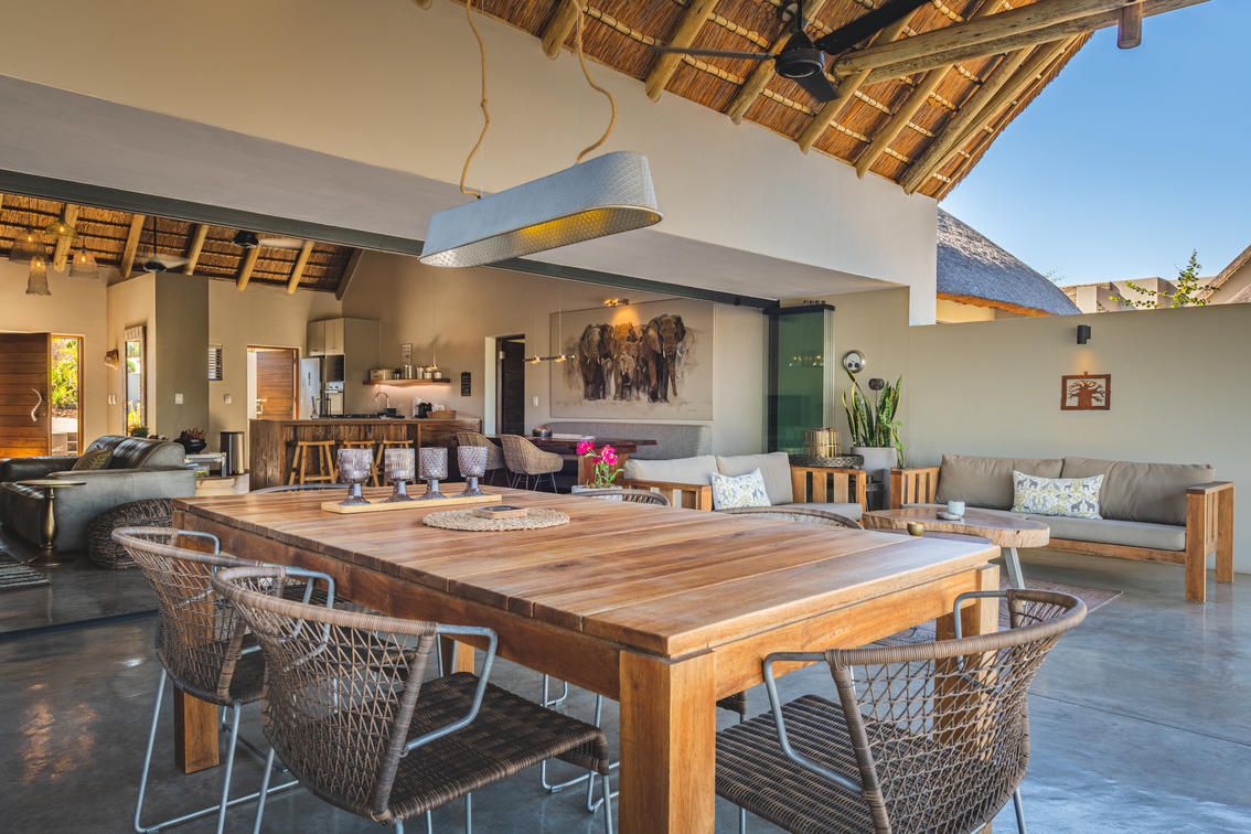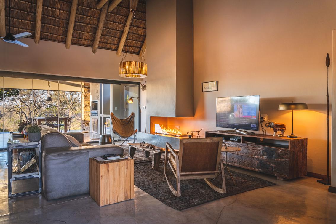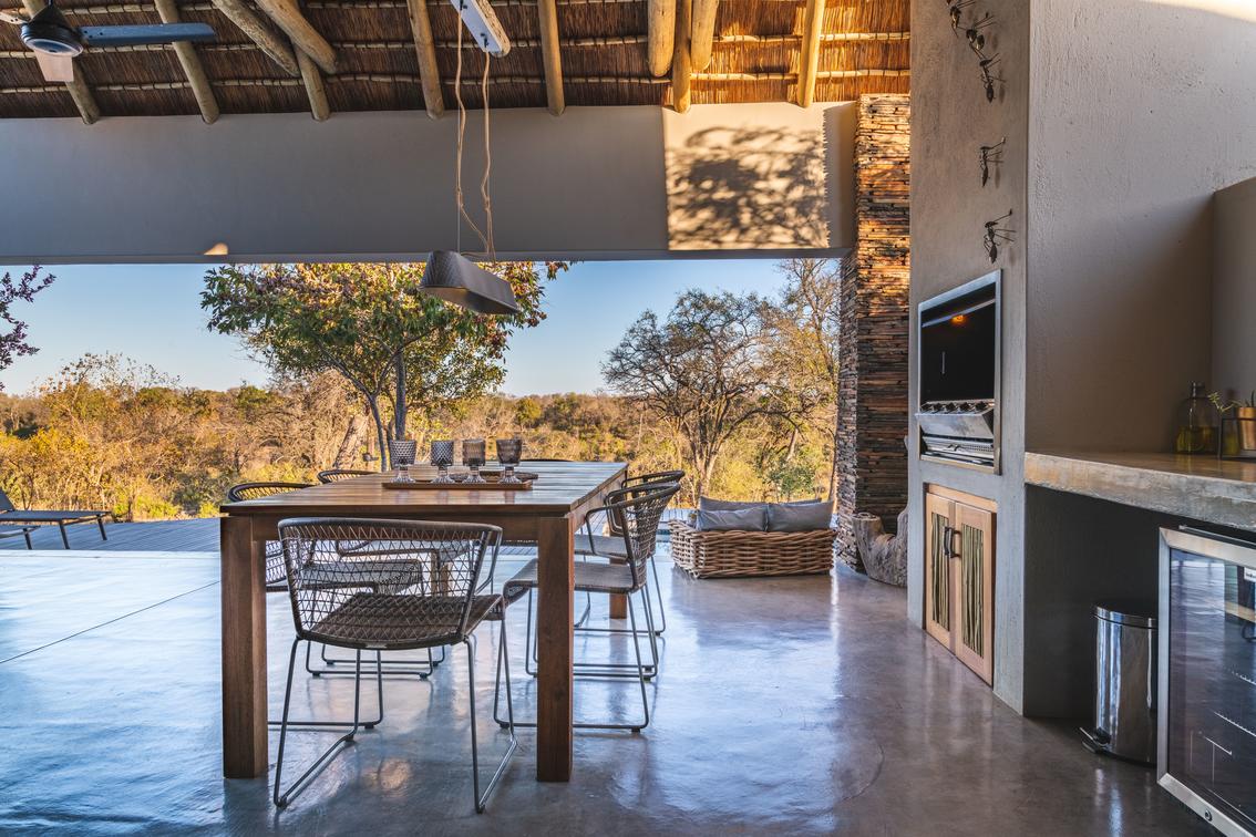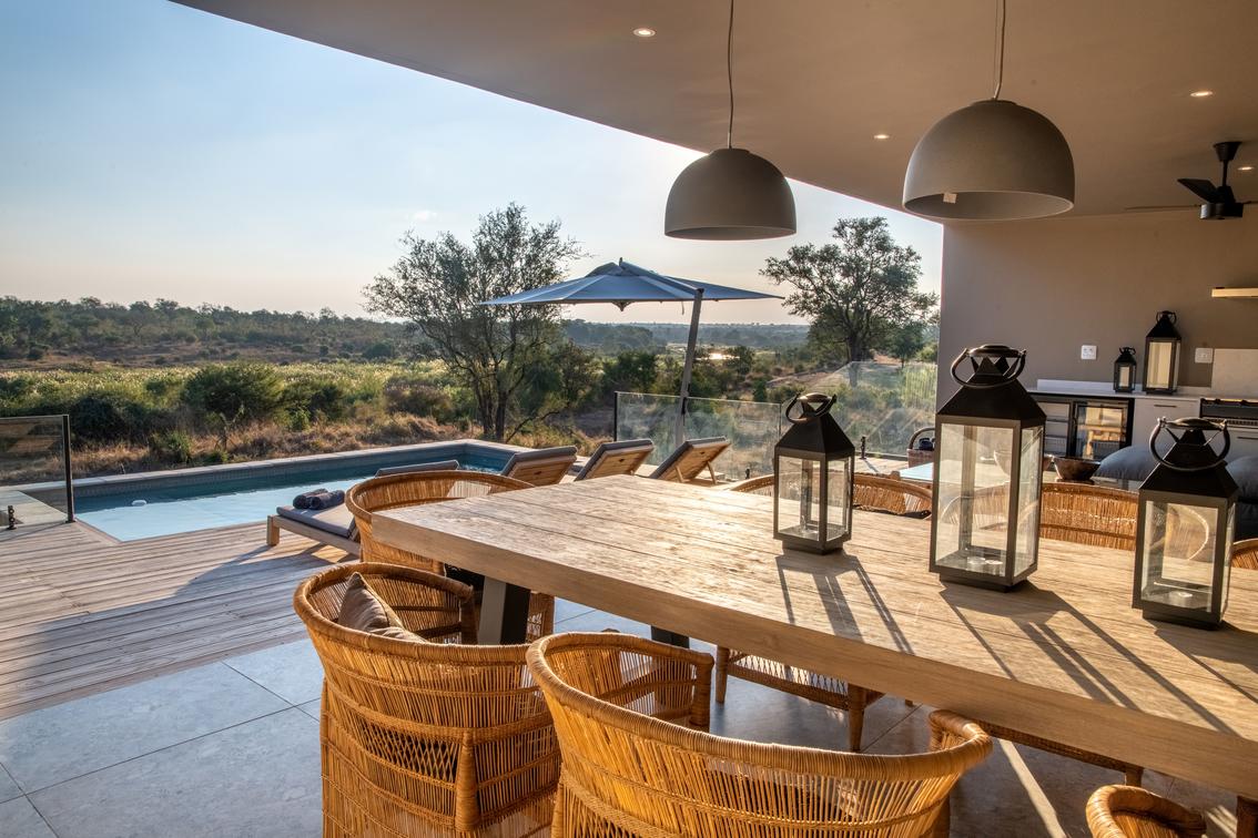 Matumi Lodge 11 can accommodate 4 guests comfortably. The two spacious air-conditioned bedrooms have an en-suite bathroom and a shower/bath under the open sky. Mosquito nets are provided during the rainy season. A private patio facing the Kruger Park invites you to have your morning tea or coffee outside and to enjoy listening to the magic sounds of the bush before you go to bed. The large central living space has a fully equipped kitchen enabling you to curate your own culinary experience. At the heart of the bespoke dining area is a beautiful and unique Matumi table, from which the lodge takes its name. During the cooler evenings guests will appreciate the warmth of the cosy designer fireplace in the lounge. Frameless glass sliding doors connect the interior to the covered patio which offers an inviting living area overlooking the pool. The patio's gas braai is a good alternative to the open fireplace in the sheltered boma where you can sit and relax around the fire.