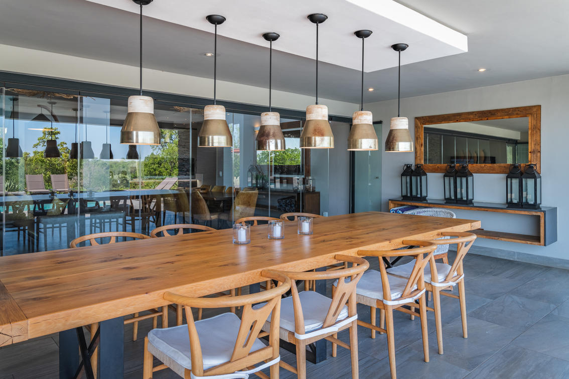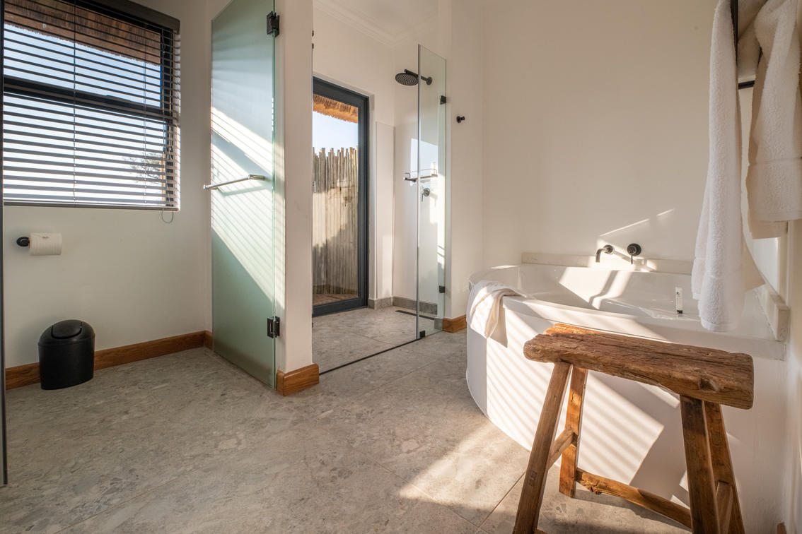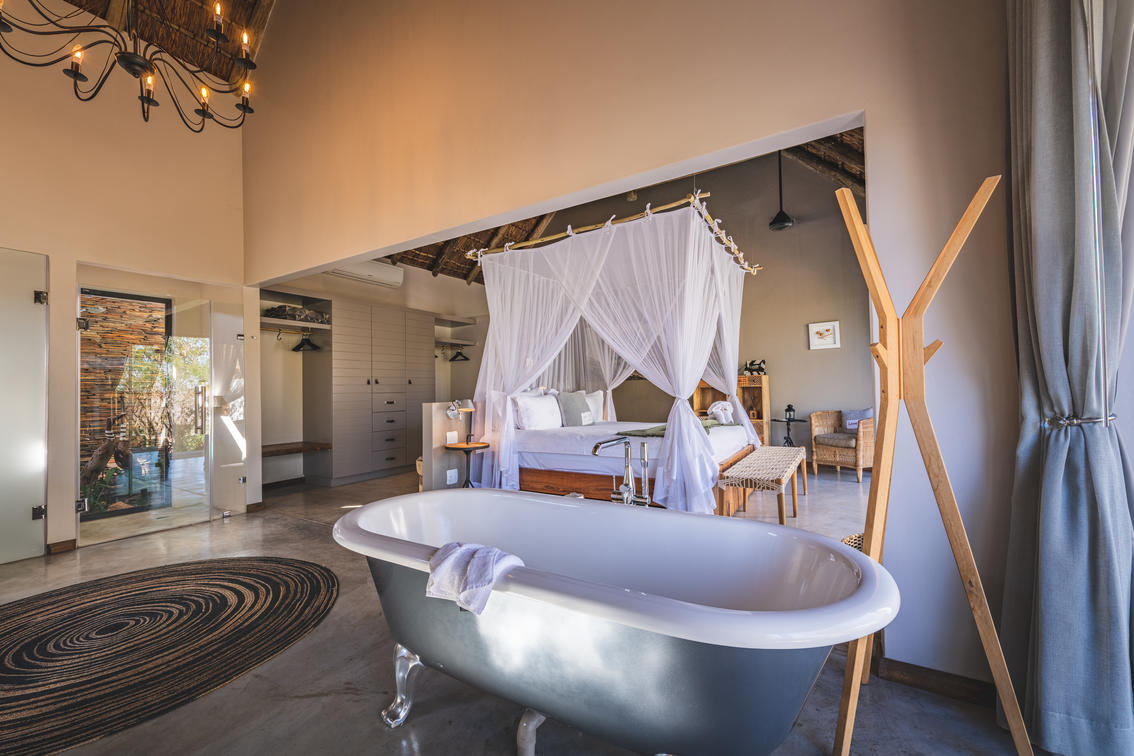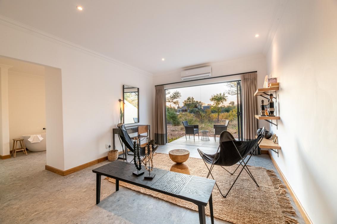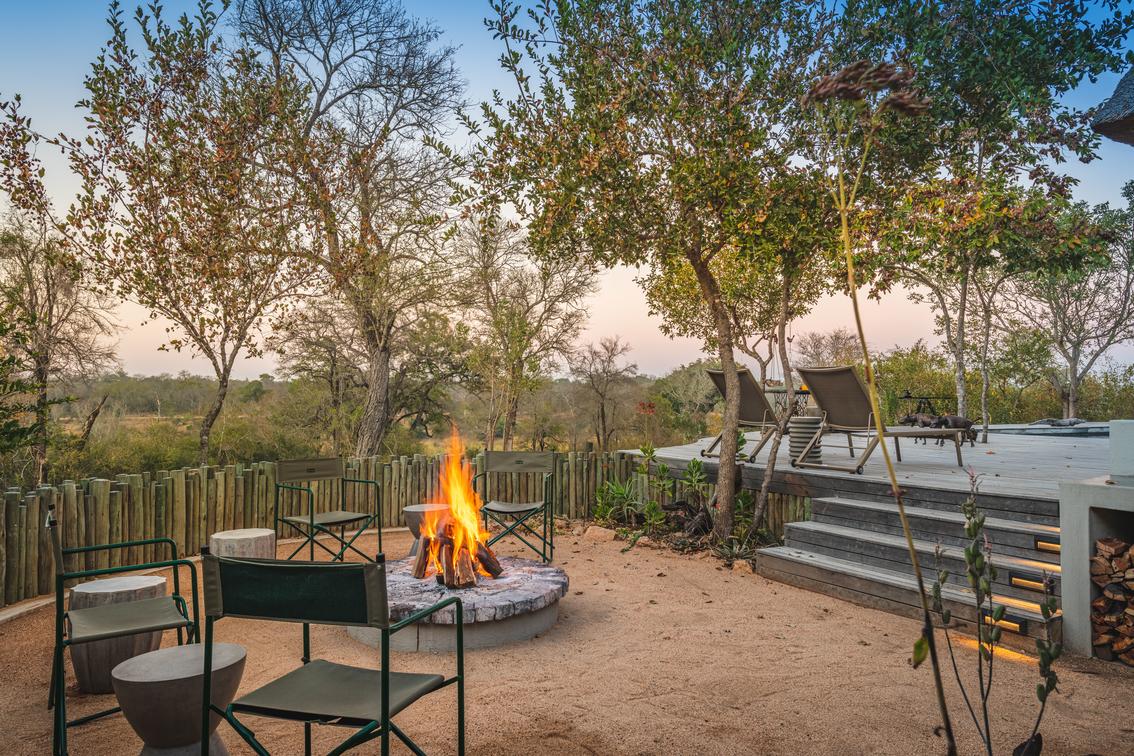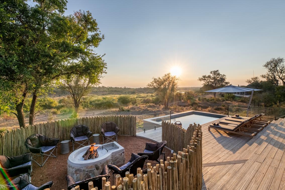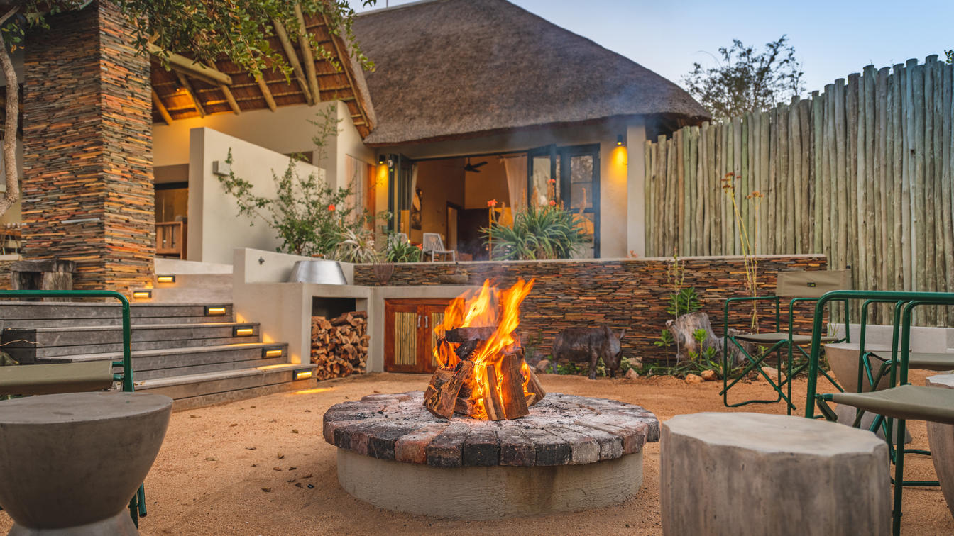 Matumi Lodge 11 can accommodate 4 guests comfortably. The two spacious air-conditioned bedrooms have an en-suite bathroom and a shower/bath under the open sky. Mosquito nets are provided during the rainy season. A private patio facing the Kruger Park invites you to have your morning tea or coffee outside and to enjoy listening to the magic sounds of the bush before you go to bed. The large central living space has a fully equipped kitchen enabling you to curate your own culinary experience. At the heart of the bespoke dining area is a beautiful and unique Matumi table, from which the lodge takes its name. During the cooler evenings guests will appreciate the warmth of the cosy designer fireplace in the lounge. Frameless glass sliding doors connect the interior to the covered patio which offers an inviting living area overlooking the pool. The patio's gas braai is a good alternative to the open fireplace in the sheltered boma where you can sit and relax around the fire.