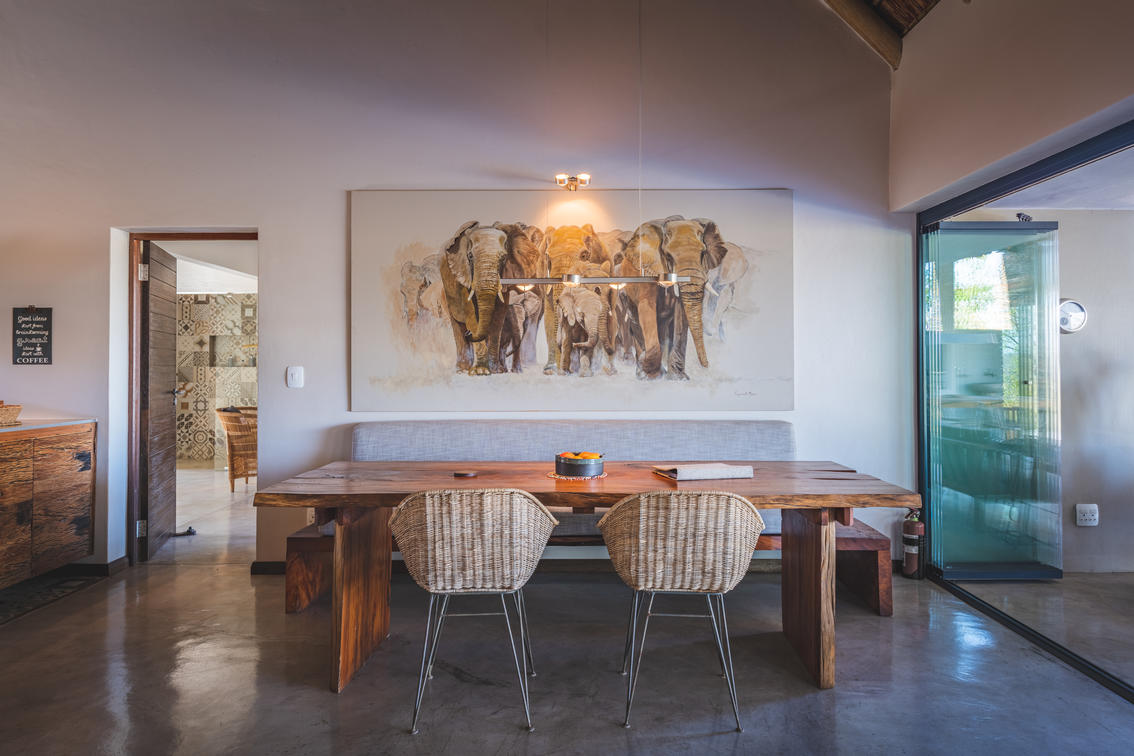 Tintswalo@Elephant Point a Lodge is situated on the banks of the magnificent Sabi River, providing spectacular views into the Kruger National Park. This fully air-conditioned spacious residence comprises of three bedrooms all of which boast private en-suite open plan bathrooms, outdoor showers, private patios and TV’s in all bedrooms. The Living area offers a modern open-plan feel, consisting of a specialized gourmet kitchen and scullery, grand dining area and a lounge which will impress any movie enthusiast, with its Ultra HD TV, and DSTV Explora. There is a study which can be converted into a pyjama lounge or play room and an outdoor entertainment area which can be screened off completely with mosquito screen doors. The entire living area opens up and spills out onto a large covered patio which offers a gas braai, heated pool, and its Own private boma. This lodge’s electricity, and pool pump is fully operational on a generator during load shedding.