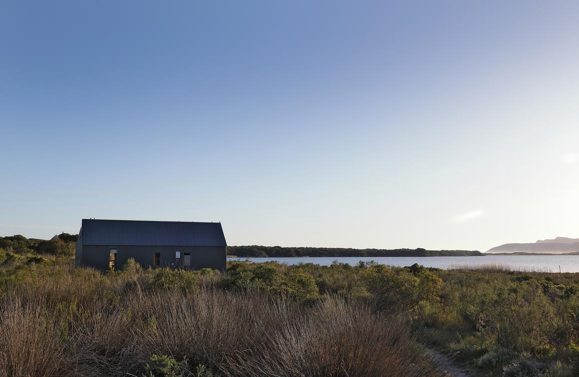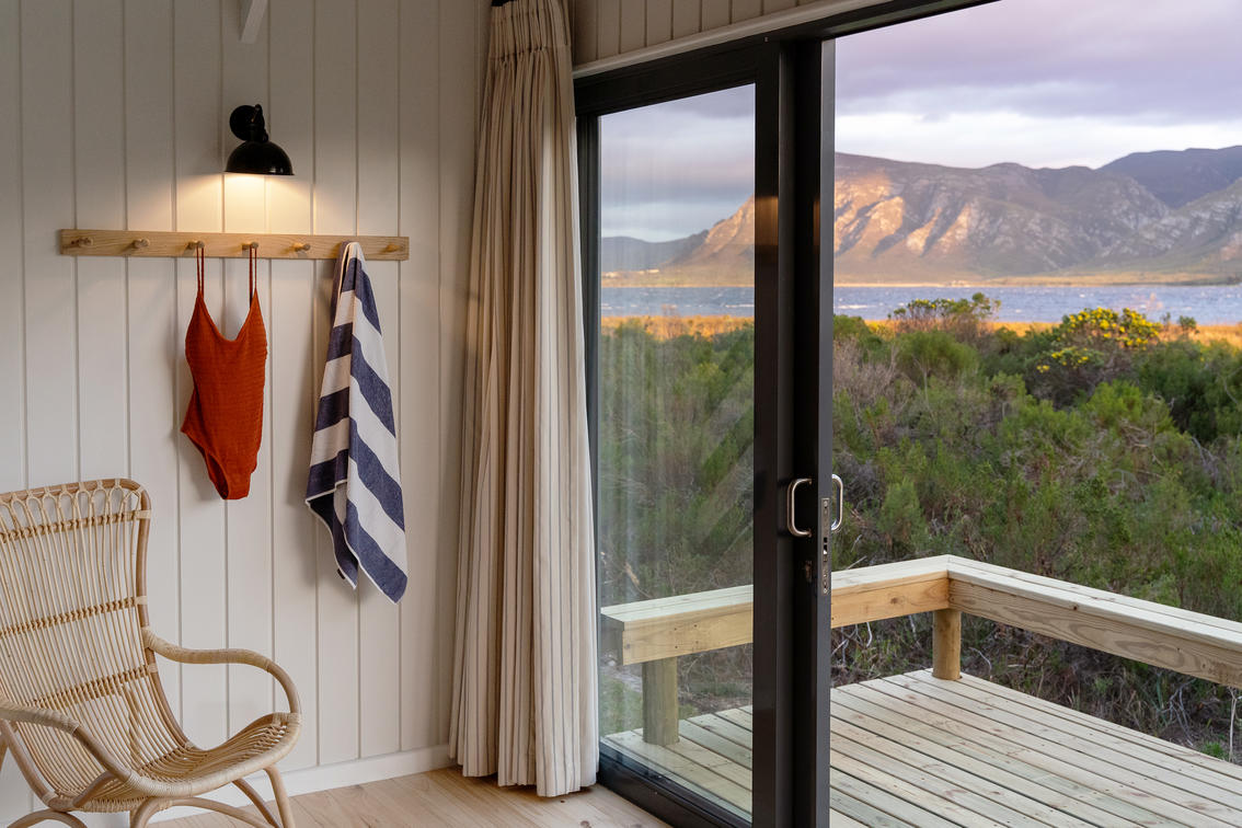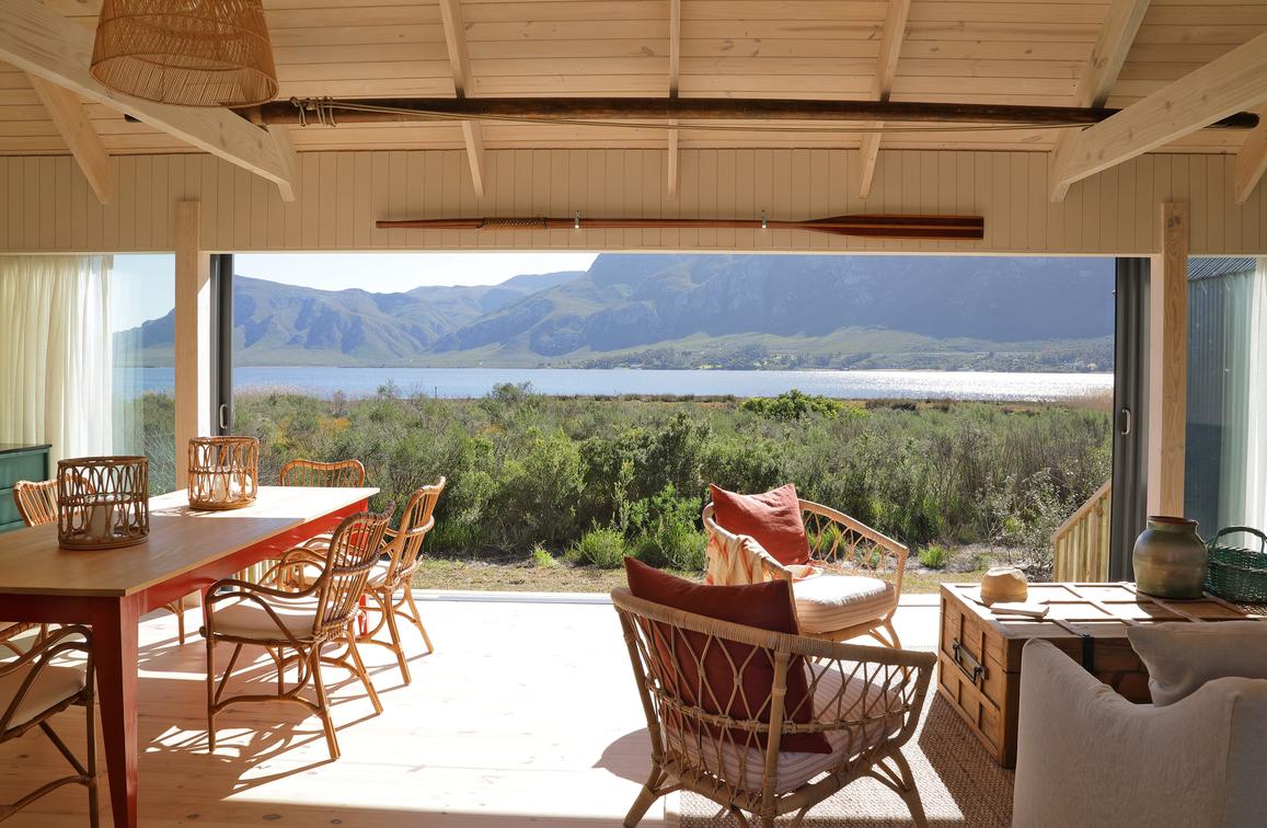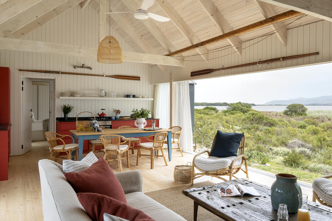 The heart of the house is its open-plan lounge, dining, and kitchen, where vaulted ceilings create a bright, airy space that flows effortlessly onto the lawn, fynbos, and lagoon beyond. On chilly winter nights, a wood-burning fireplace and a wood-burning hot tub on the private deck adds the perfect touch of warmth and ambiance.