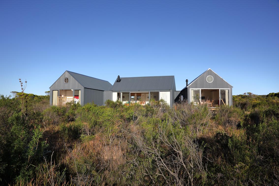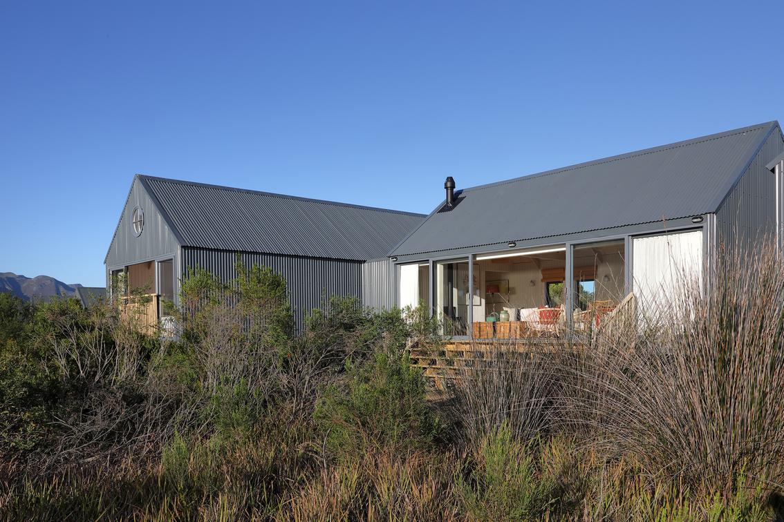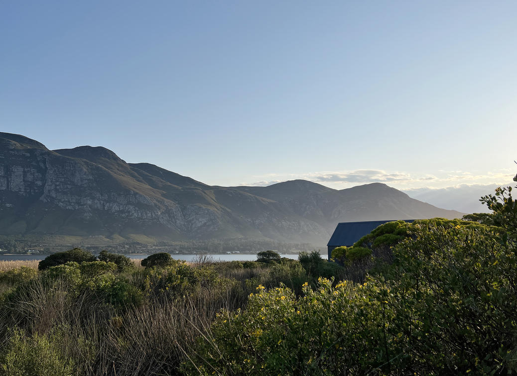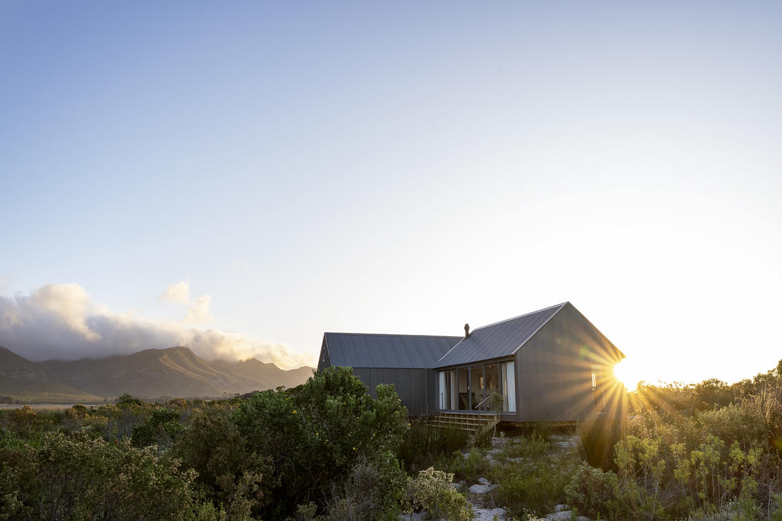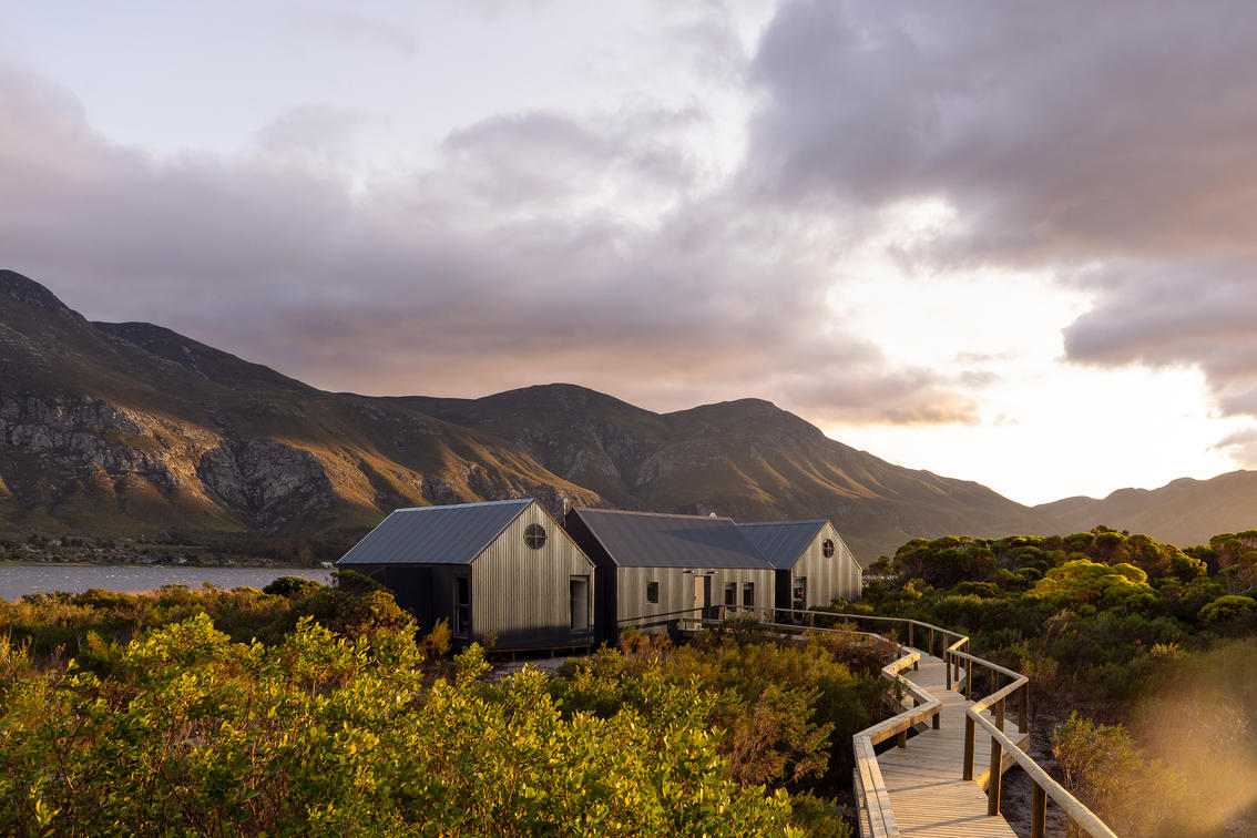 The heart of the house is its open-plan lounge, dining, and kitchen, where vaulted ceilings create a bright, airy space that flows effortlessly onto the lawn, fynbos, and lagoon beyond. On chilly winter nights, a wood-burning fireplace and a wood-burning hot tub on the private deck adds the perfect touch of warmth and ambiance.