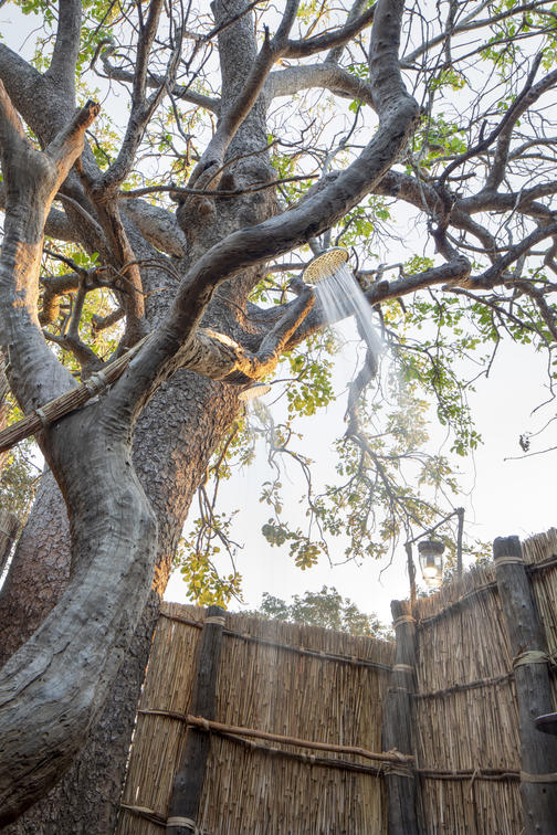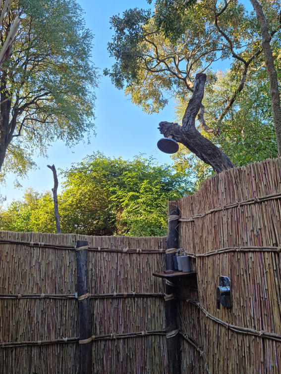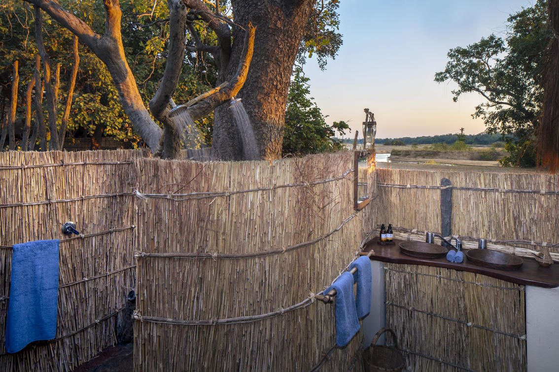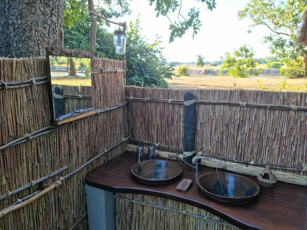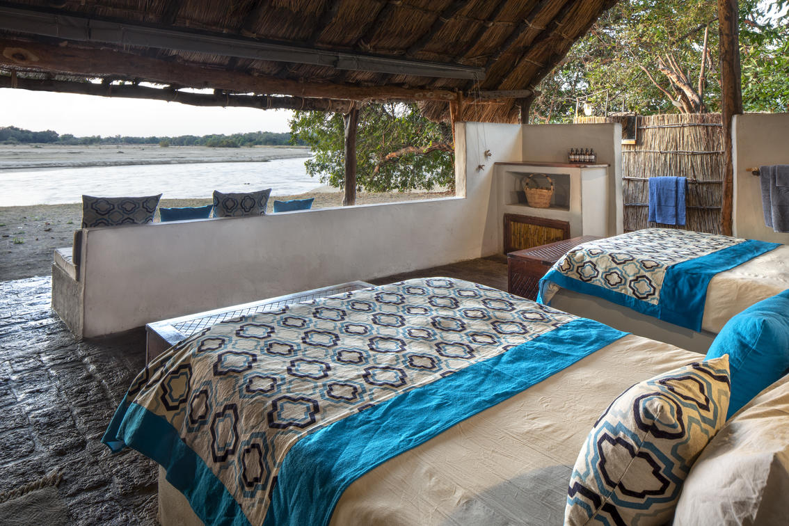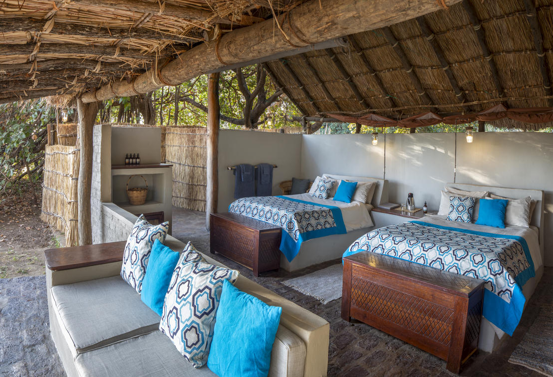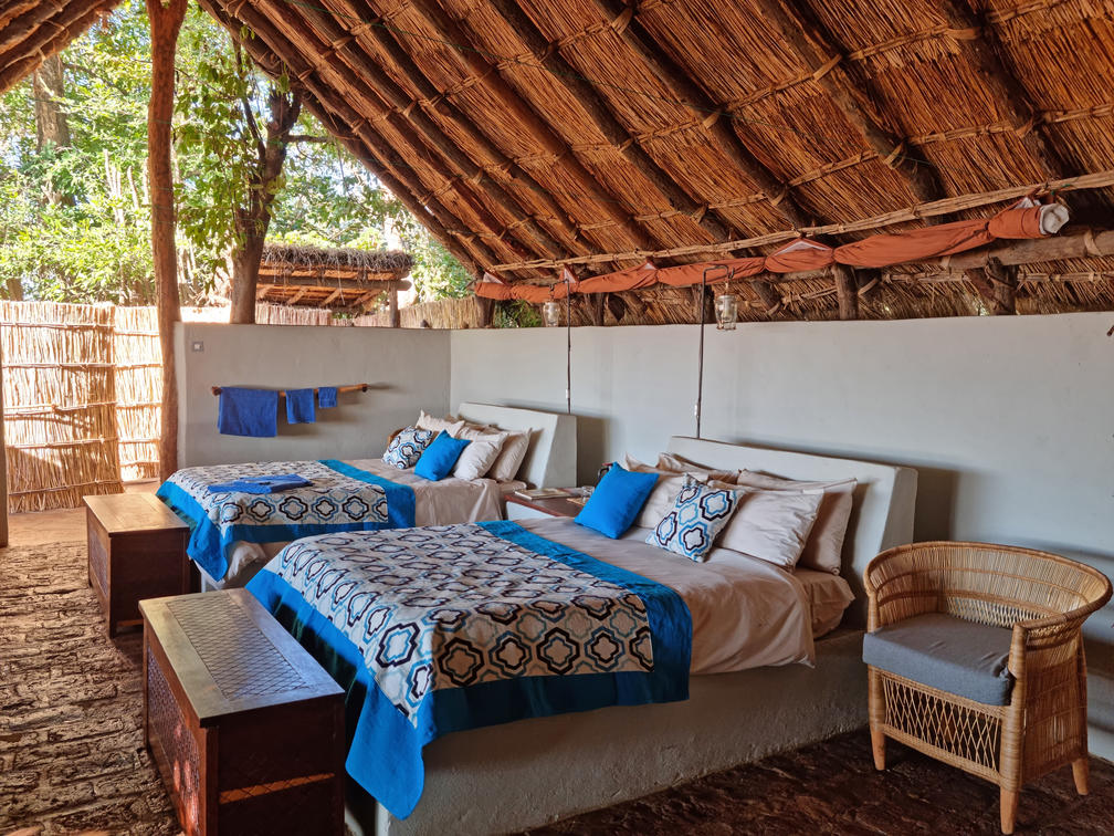 Twin chalet with two double beds. En-suite facilities with shower, basin and toilet. Running water with hot water available at all times. Verandah looking out over the river. Brick base with natural thatch walls and roof made from natural materials and local skills.