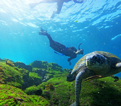 Plunge into the undersea wonders of the Galapagos. Snorkel among technicolor coral reefs, inquisitive sea lions, and schools of dazzling tropical fish. Witness the marine ballet of creatures like penguins and sea turtles in their aquatic playground.