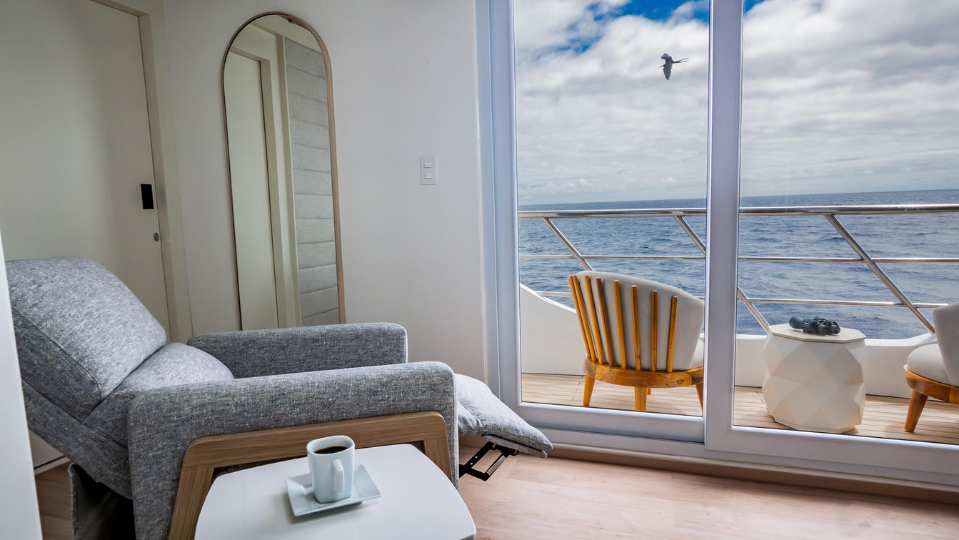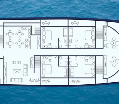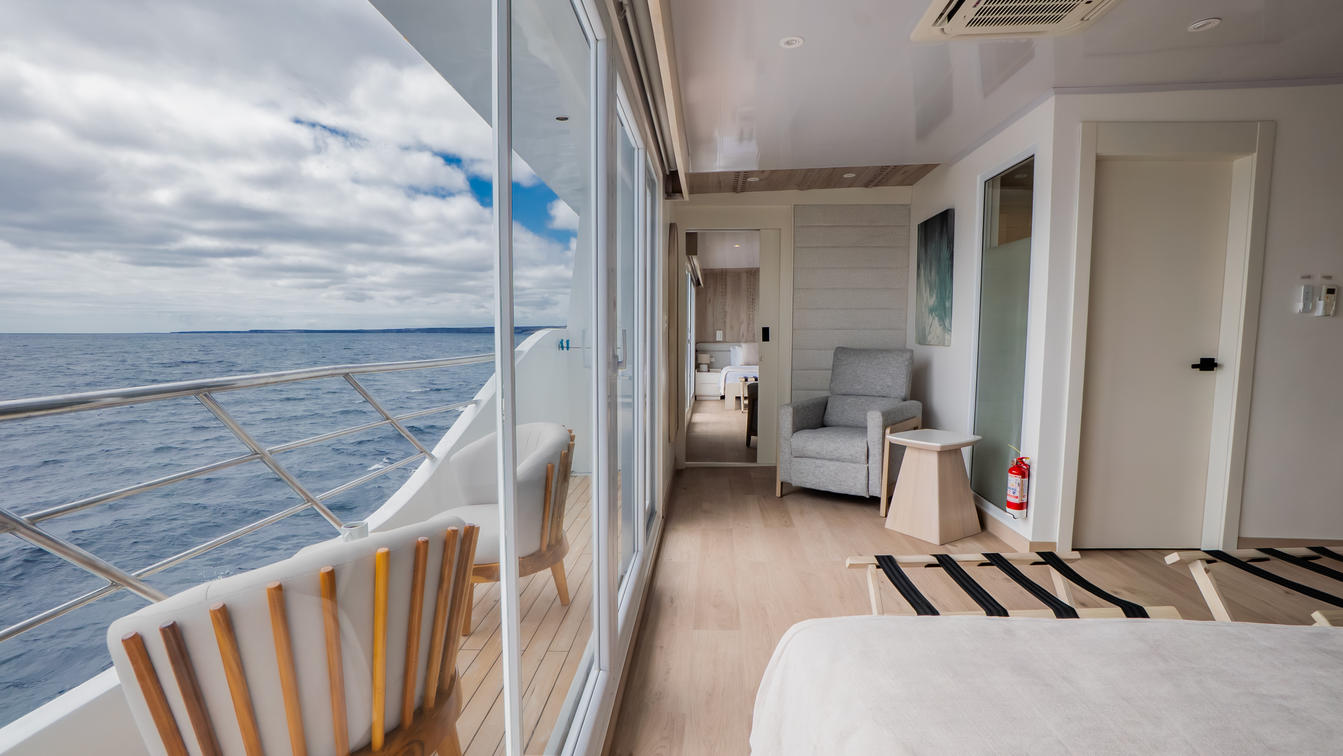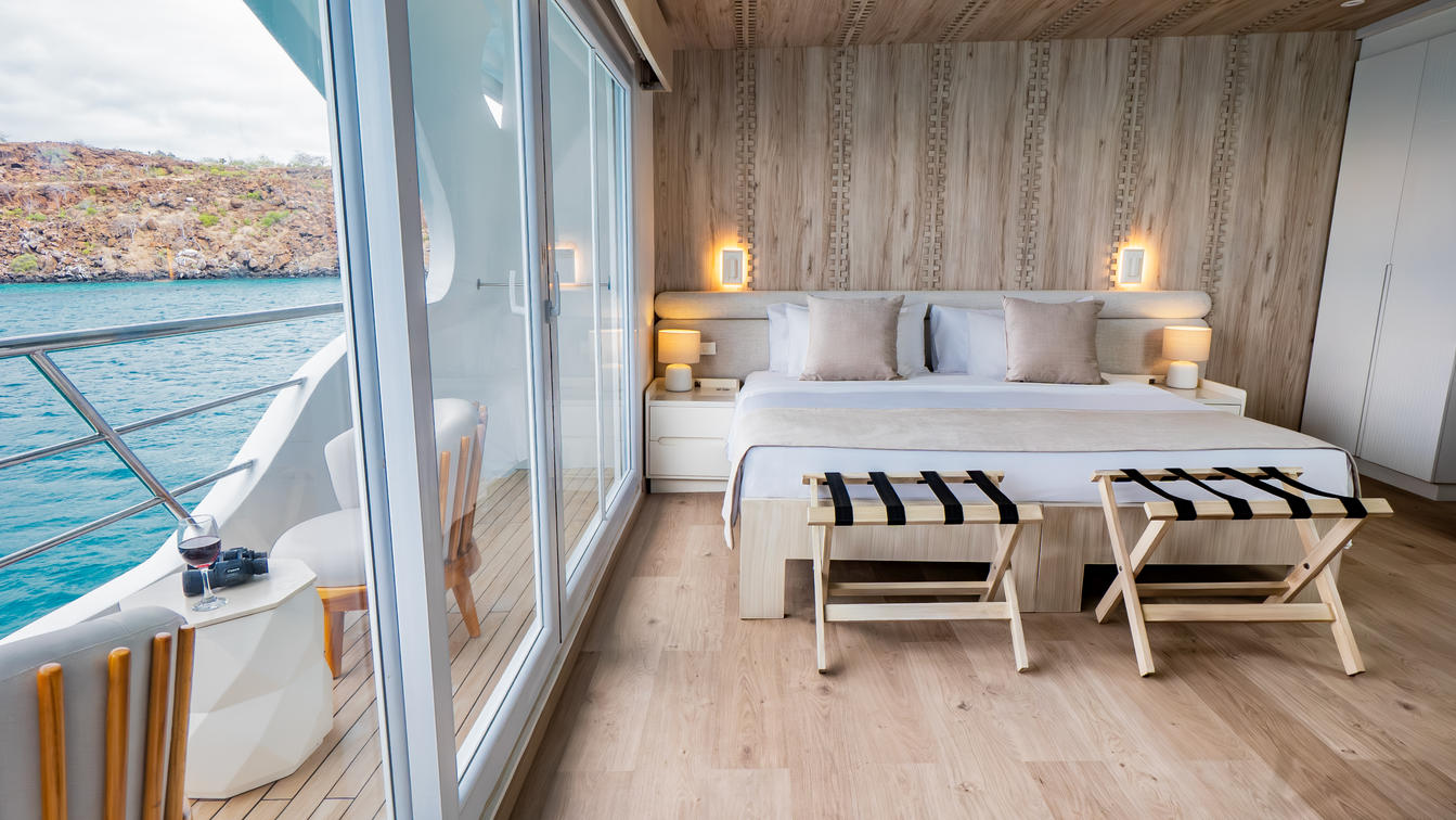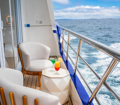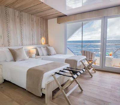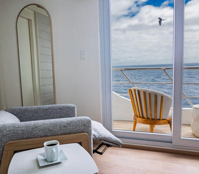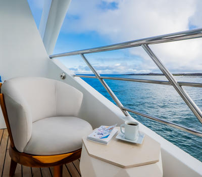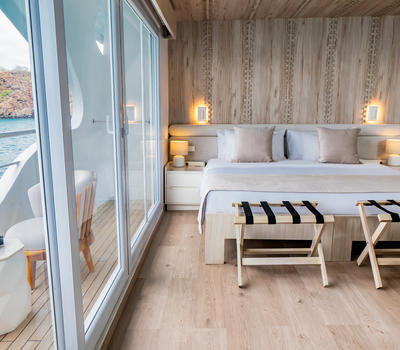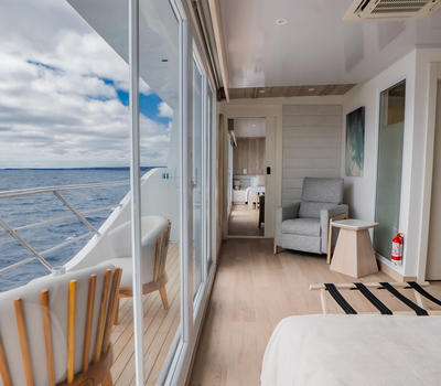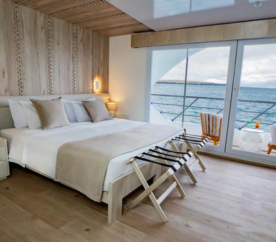 On board the Endemic, the eight Golden Panoramic Suites are airy and comfortable, four of them are located on the main deck and the rest on the upper deck. Each suite has a private balcony; all suites have personalized air conditioning control and panoramic views of the islands due to its wall to wall glass doors instead of walls toward the outside. A small social area, closet/drawer, desk and sofa-bed are part of each suite as well. king size or two double beds are available in each suite for flexible accommodation. Private bathroom, hot and cold water and amenities.