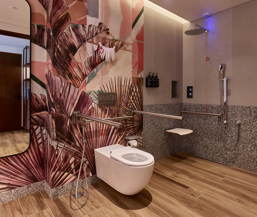 This generously sized accessible room boasts a king-sized bed and a private balcony, decked with sun beds for blissful relaxation. The bathroom offers the convenience of a roll-in shower. Enjoy the finer things in life including an espresso machine and a delightful welcome gift. Other amenities include an in-room safe and ironing facilities. Ideal accommodation for up to two guests.