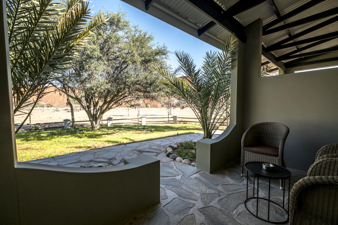 The rooms are situated at the foot of the fossilised dunes overlooking grassy savanah's or the base of the dunes. The rooms have twin beds, en suite bathrooms (showers), air-conditioners and a veranda.