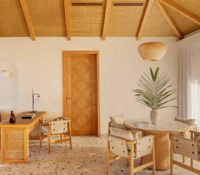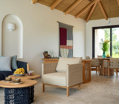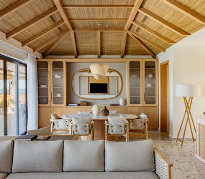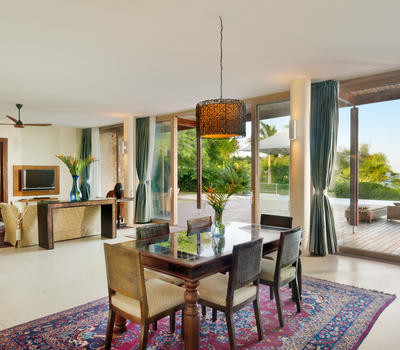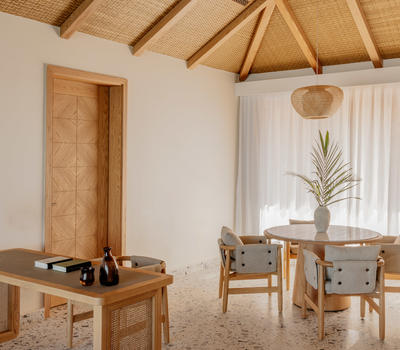 These villas offer a serene living room and dining area, blending modern