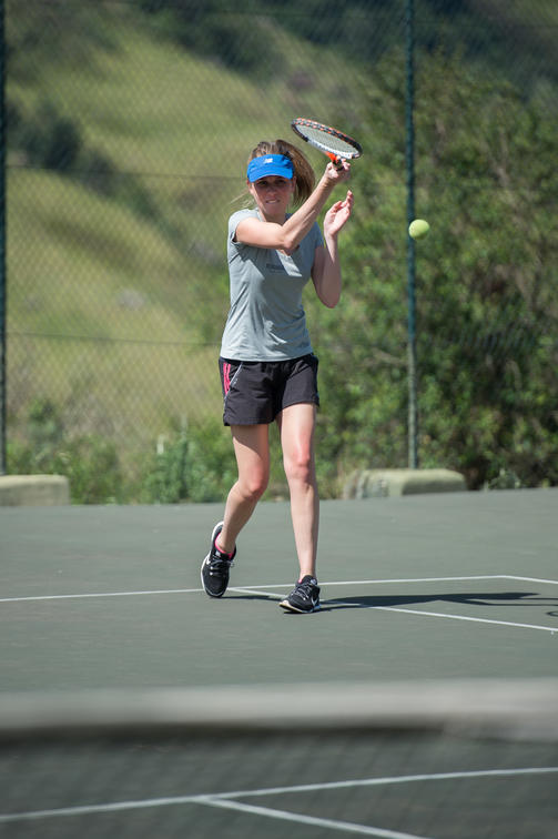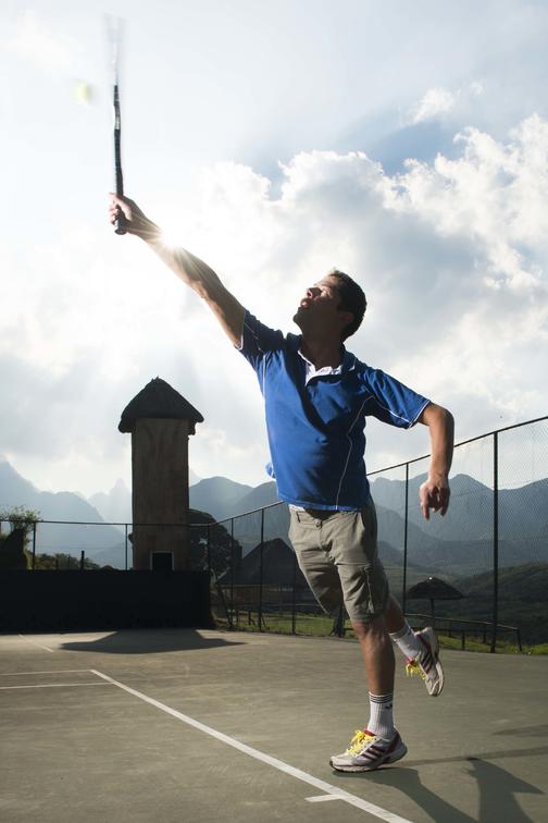 Guests can enjoy a game of tennis on Cathedral Peaks courts with the mountains in the background