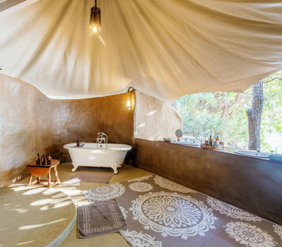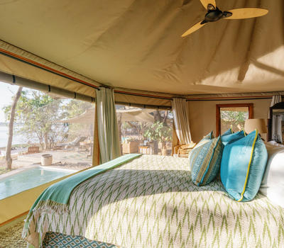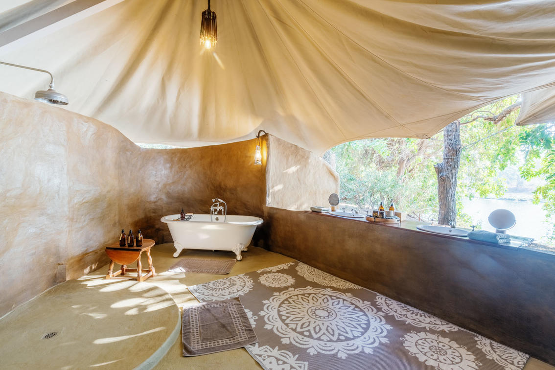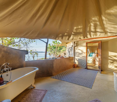 The Cassia Suite sleeps two guests in a spacious bedroom with elegant en-suite bathroom, with a private dining room and lounge area. The whole suite is open air, with views of the confluence of the Chongwe and Zambezi Rivers on one side and the Zambezi Escarpment on the other. Wildlife regularly pass through the area, with elephants often playing and crossing the channel directly in front of the suite.