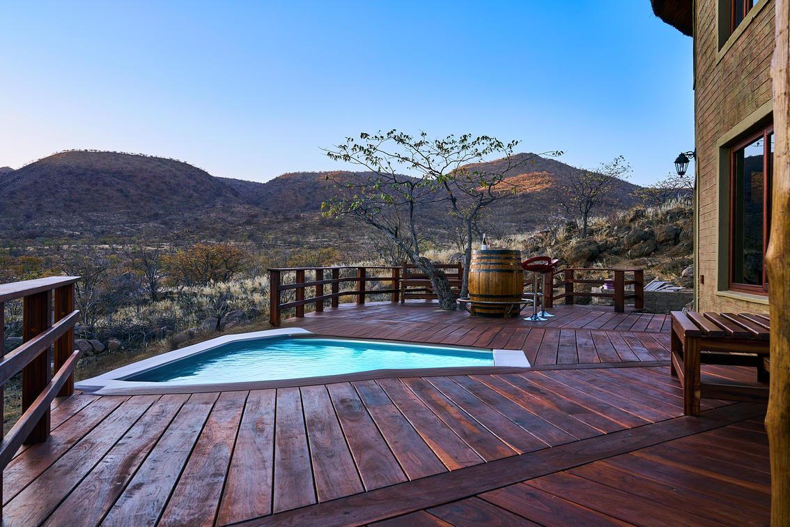 The spacious, open-plan design features elegant furnishings, a private balcony with sweeping views of the Huab River Valley, and large windows that invite the outdoors in. The ground floor includes a cozy lounge area and a well-appointed- kitchen and bathroom. Upstairs, the master bedroom offers panoramic views and a private balcony where guests can enjoy the sights and sounds of the African bush. This bathroom boasts a luxurious soaking tub, perfect for unwinding after a day of exploration.