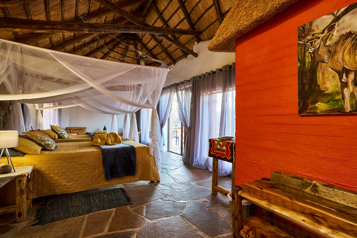 Huab Lodge’s eight spacious, extensively refurbished, stone and thatch bungalows - accommodating a maximum of 16 guests – are spread along the elevated north bank of the river ensuring a magnificent and private view of the Huab River Valley, even from the shower!