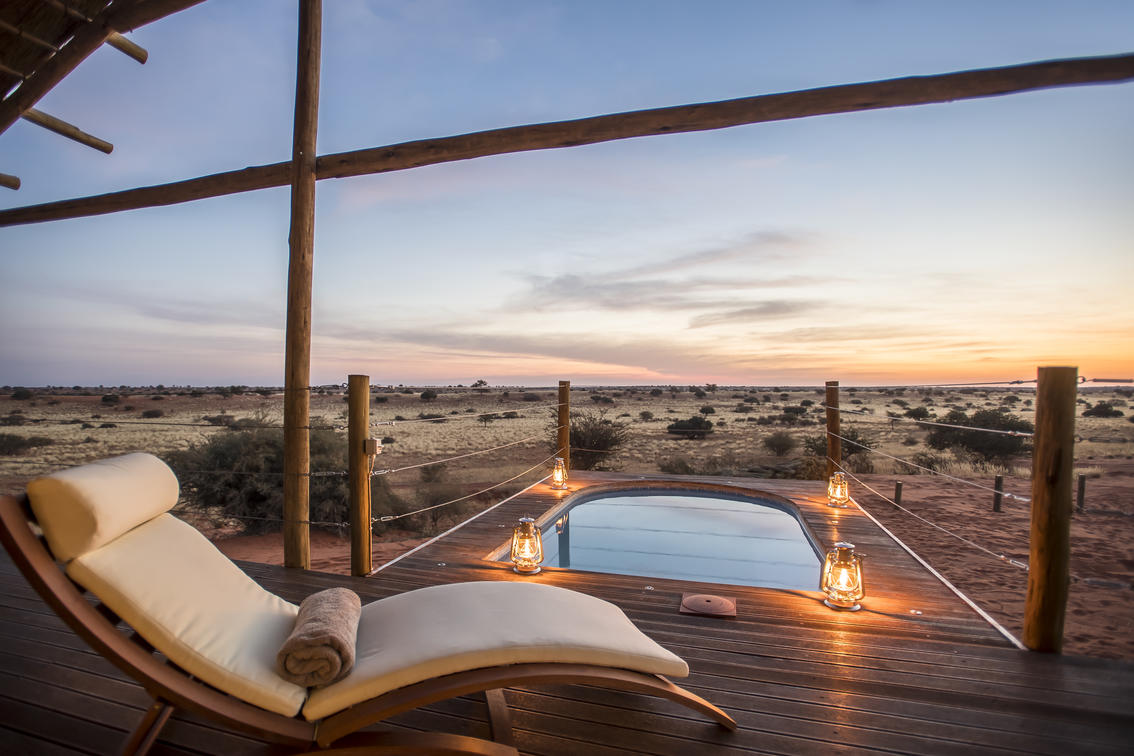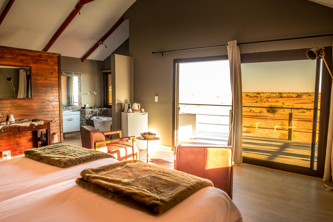 Well separated from each other, stand alone on stilts on top of the red dunes, with unsurpassed views to the south-west accross the dune landscape. Each with ensuite facitilities bath and shower, air-conditioning, coffee/tea station and mini bar.