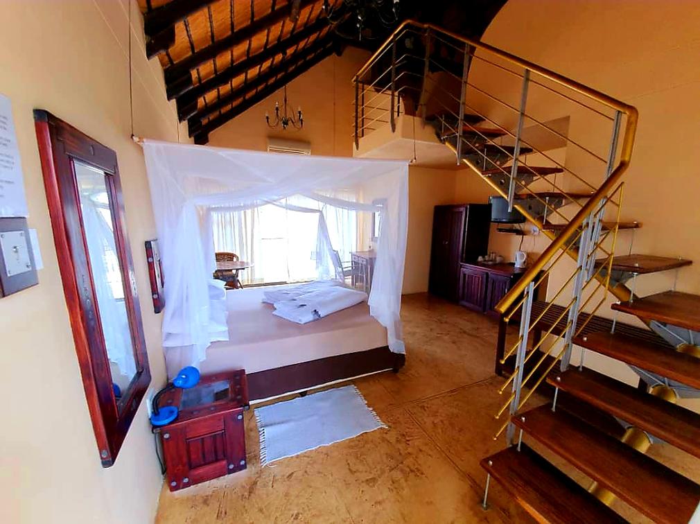 Luxury air-conditioned thatched chalets elegantly decorated and furnished offering the comforts of home. An upstairs loft with 2 single beds and a double bed downstairs, ideal for family use.