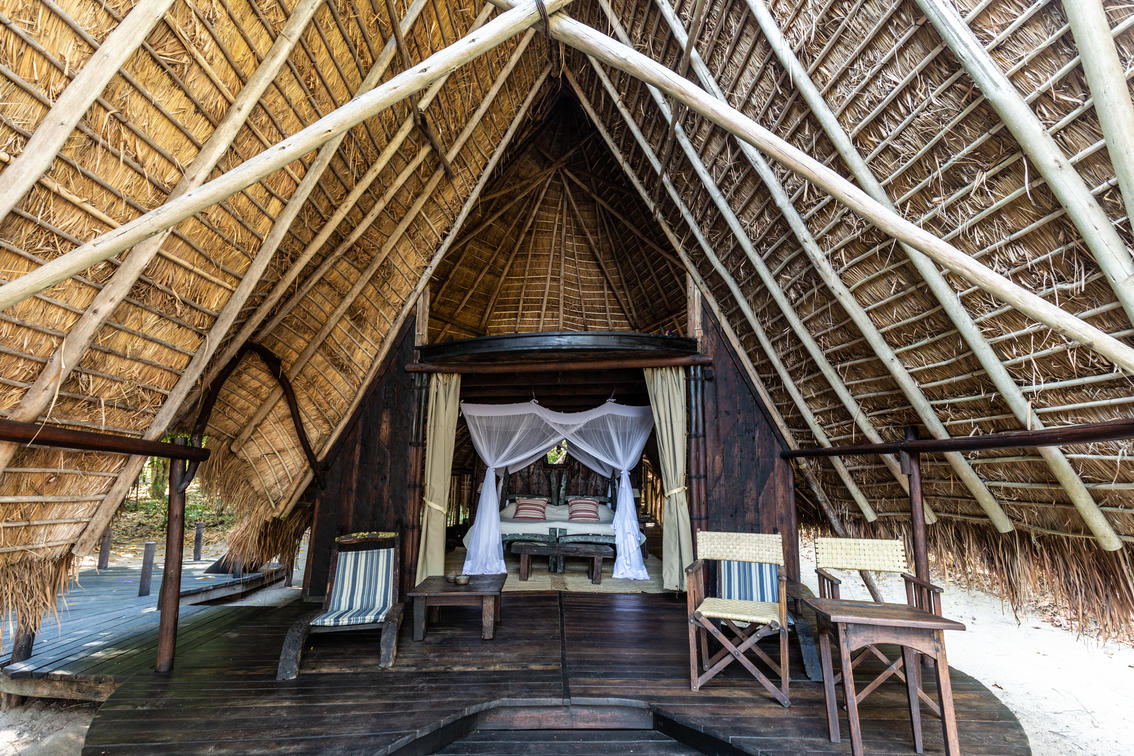 The eight A-frame bandas at Greystoke are entirely in-keeping with the setting. When Roland Purcell established his camp here, he was conscious of the responsibility of ensuring a light footprint.  Built of thatch and salvaged dhow wood, each of the open-fronted rooms is tucked into the treeline, almost invisible to the passing fishermen in their small canoes. The rooms all have verandahs and an upstairs chill-out lounge with views across the white sand to the vastness of Lake Tanganyika.