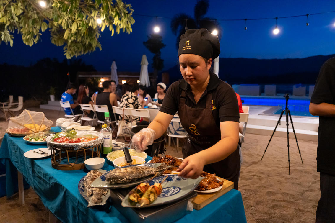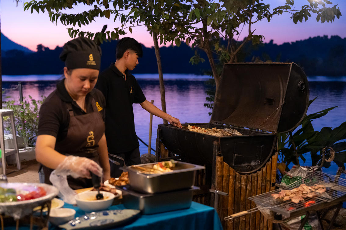 Overview: Alfresco BBQ buffet at Sanctuary Nam Ngum Beach Resort — beachside when weather permits or at the restaurant. Relaxed setting, ideal for families, small groups or events.