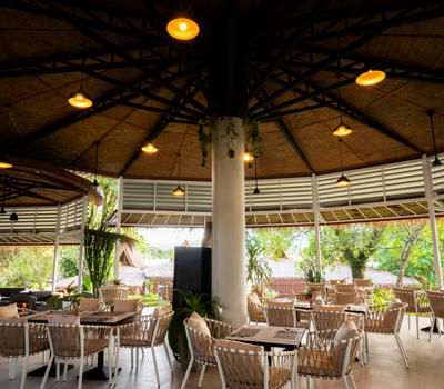 It is bordered by luxuriant nature and offers a panoramic lake view. Guests can enjoy breakfast, lunch, dinner or even enjoy a homemade cocktail at sunset and make the most of the peace and quiet that reigns in this singular place that the Resort has to offer.
