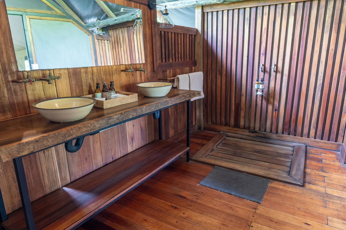 Find your sanctuary in one of our fourteen stylish Forest Tents, discreetly nestled beneath a canopy of ancient trees. These en-suite tents are crafted to harmonize with the environment, offering open-mesh sides that bring the wild in—without compromising on comfort. Relax on your private deck, an ideal spot for birdwatching or simply soaking in the natural serenity. Featuring twin vanities and a spacious indoor shower, the bathrooms offer a soothing place to unwind after a day on safari.