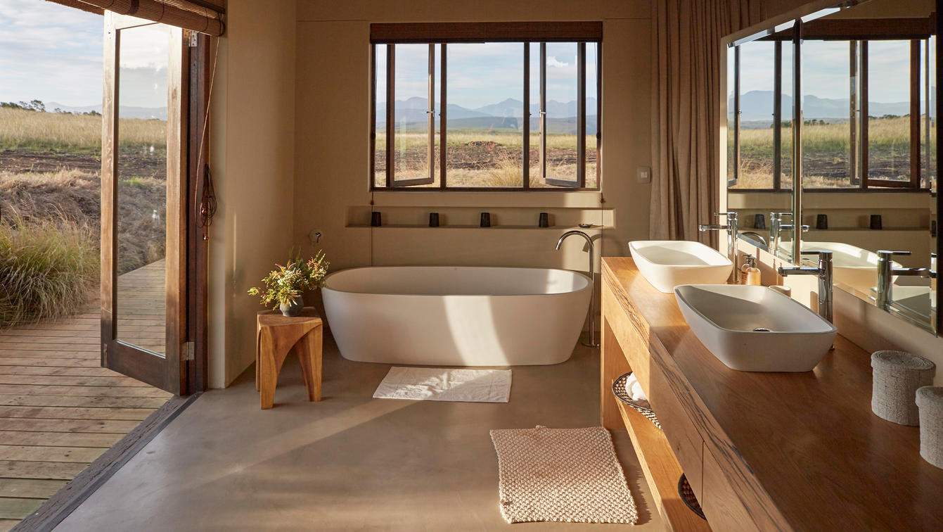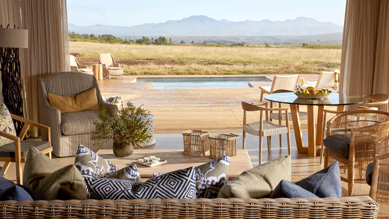 With 180-degree views of grass plains dotted with game, fynbos-covered rolling hills and the Outeniqua mountain range, Ulubisi House is tucked away in the reserve’s 1000-hectare protected walking area for endangered species.
