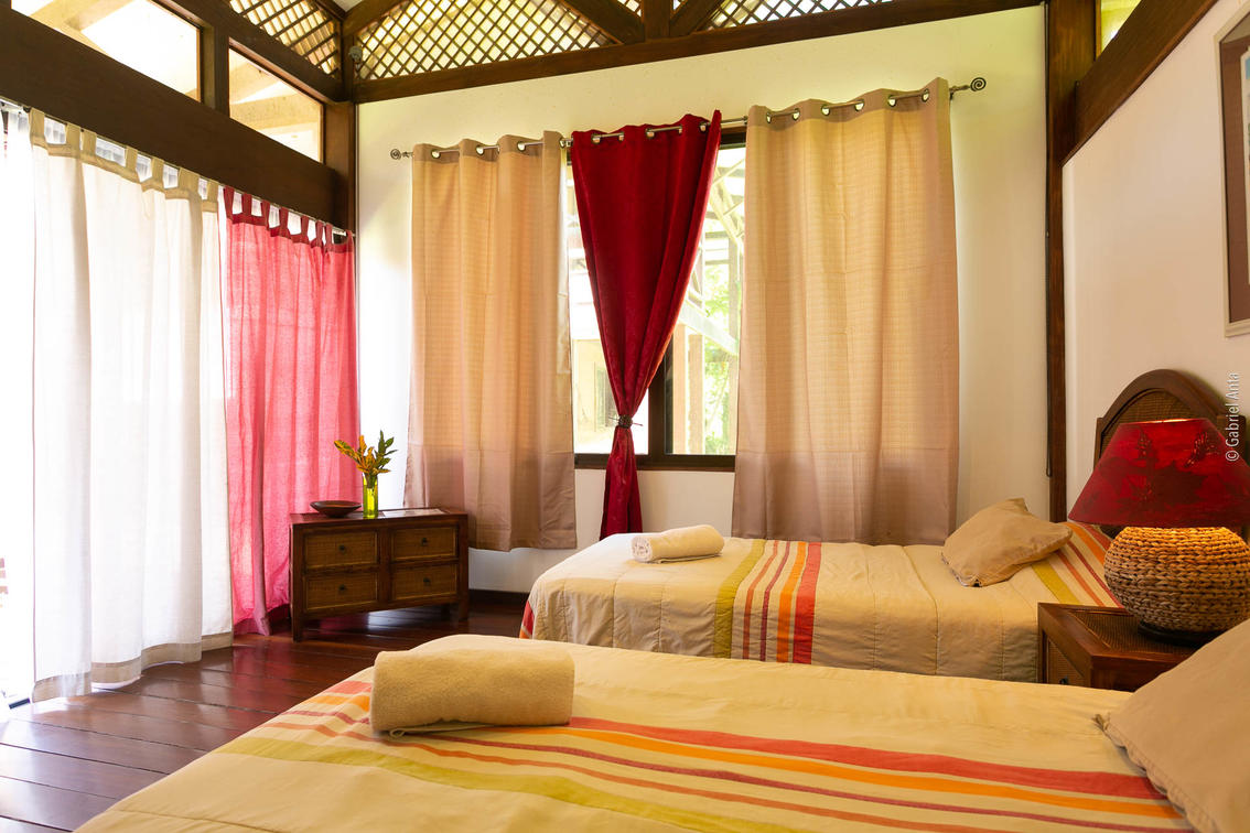 2 single beds, fan, shower room (hot water, amenities), toilets, wi-fi (fiber optics), security safe. Garden view, great terrace.