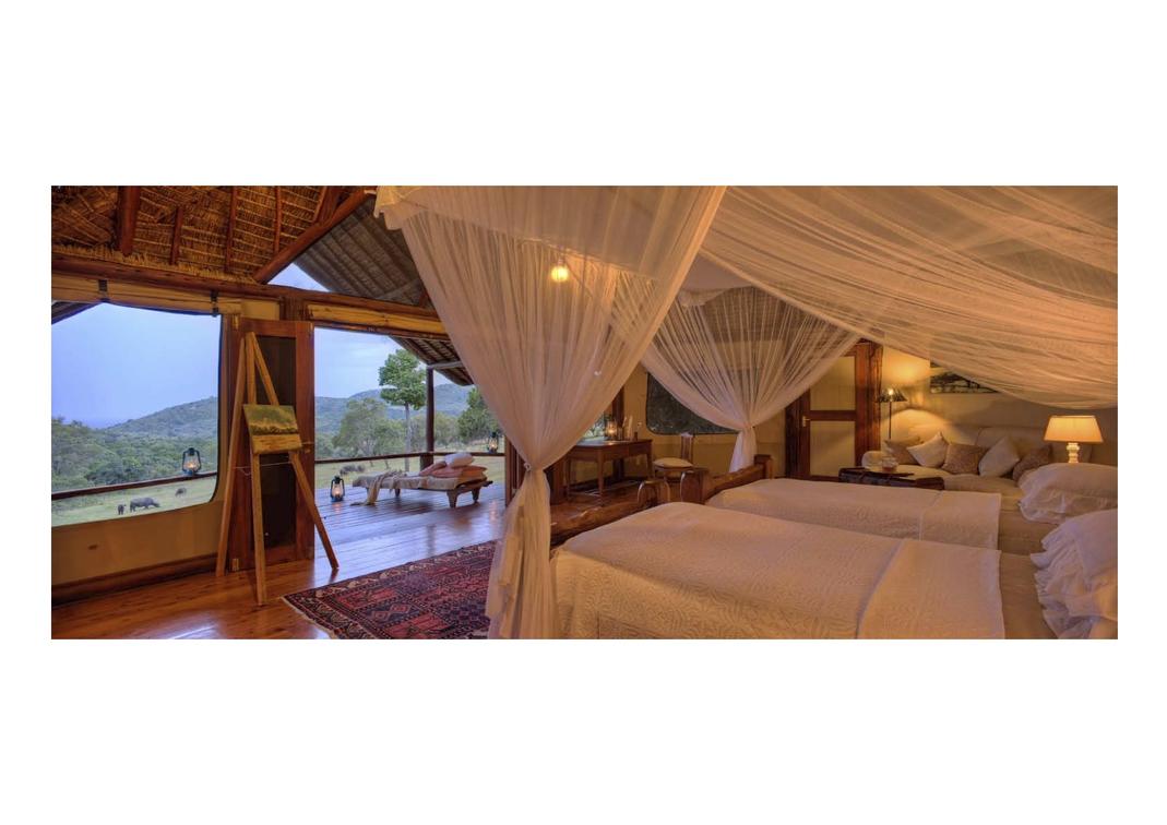 The private villa is a beautiful, private wilderness home, with two bedrooms and a children's bedroom upstairs, two bathrooms, a lounge and dining room, kitchen and large veranda. Nyati House is booked exclusively and is located a 5 minute drive away from Saruni Mara in its own secluded valley. Perfect for groups or families looking for privacy and wanting to experience the Masai Mara on their own schedule and in the comfort of their own wilderness home. Equipped with your own safari vehicle and guide and with meals in your own dining room, guests at Nyati House have a very personal experience. The house has a unique style with lots of wooden features and natural elements. The rooms are spacious and overlook your very own view of the Mara plains. There is a large front garden for children to enjoy.