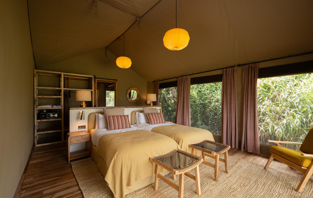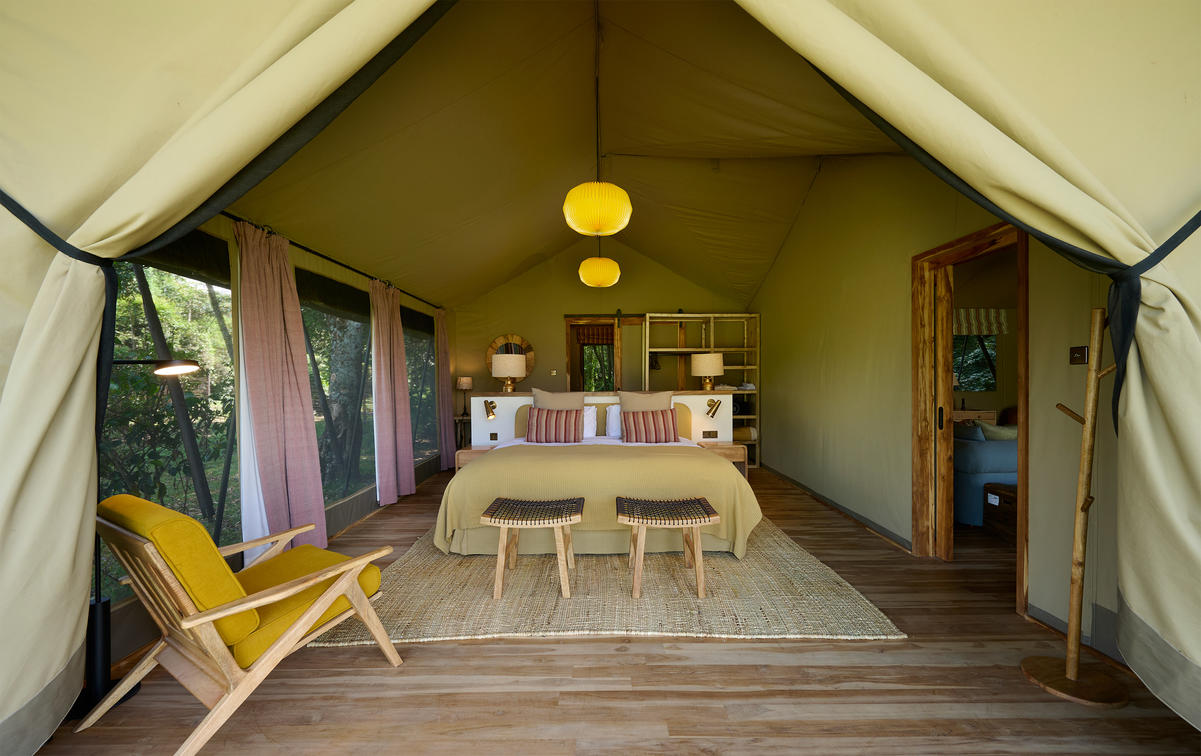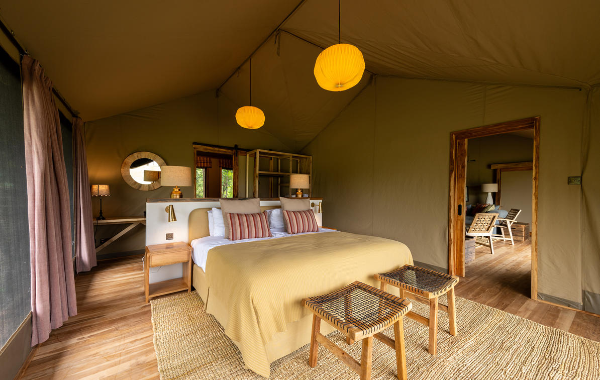 Our five new Family Tents are shaded by riverine forest and offer spectacular views across the open plains. Each unit features a (fixed) double bed on one side and a twin on the other, with the option to add a third single bed for larger groups. The twin room can also be converted into a double, perfect for two couples sharing. A central living area seamlessly connects the two bedrooms, while a wide verandah with outdoor furniture ensures you stay close to the action at all times. Two units are wheelchair-friendly.