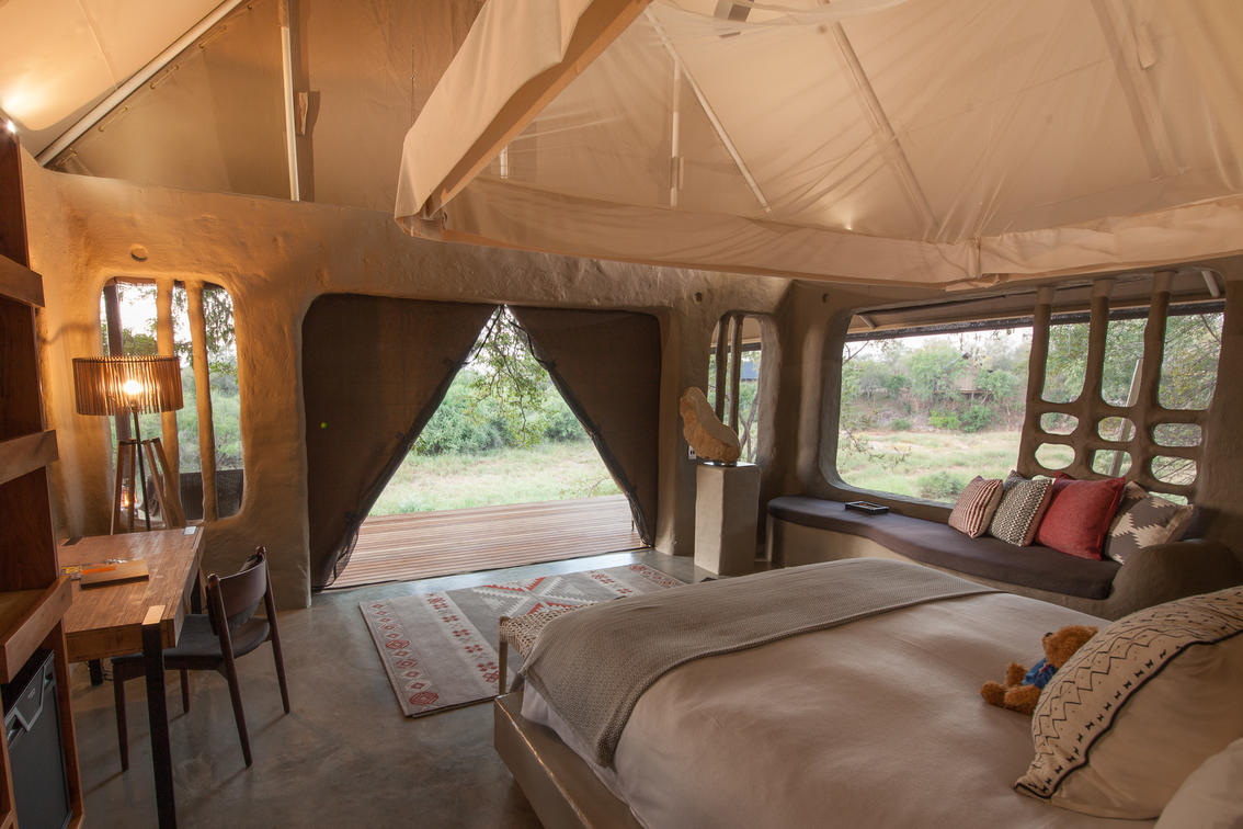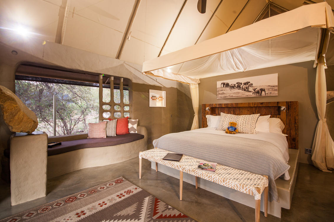 The accommodation at Garonga Safari Camp comprises of six en-suite luxury tents ideally positioned in this exquisite safari landscape. Each of the six en-suite luxury tents is sculpted out of rough-plastered walls and overarching canvas tents. The tents overlook a dry riverbed, and have a wooden deck complete with hammock that commands spectacular views. The rooms are light, airy and spacious with large, draped beds and indoor/outdoor showers.