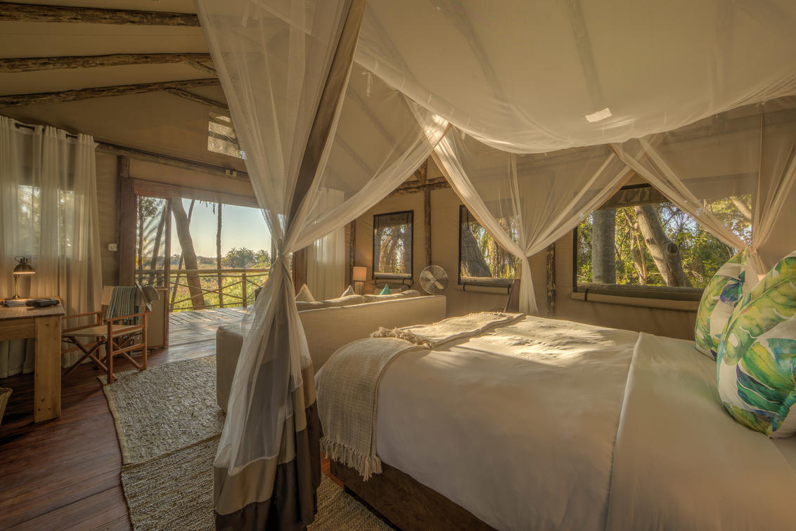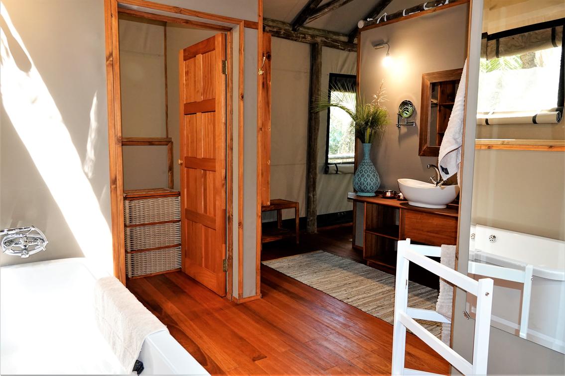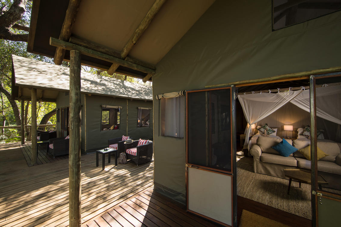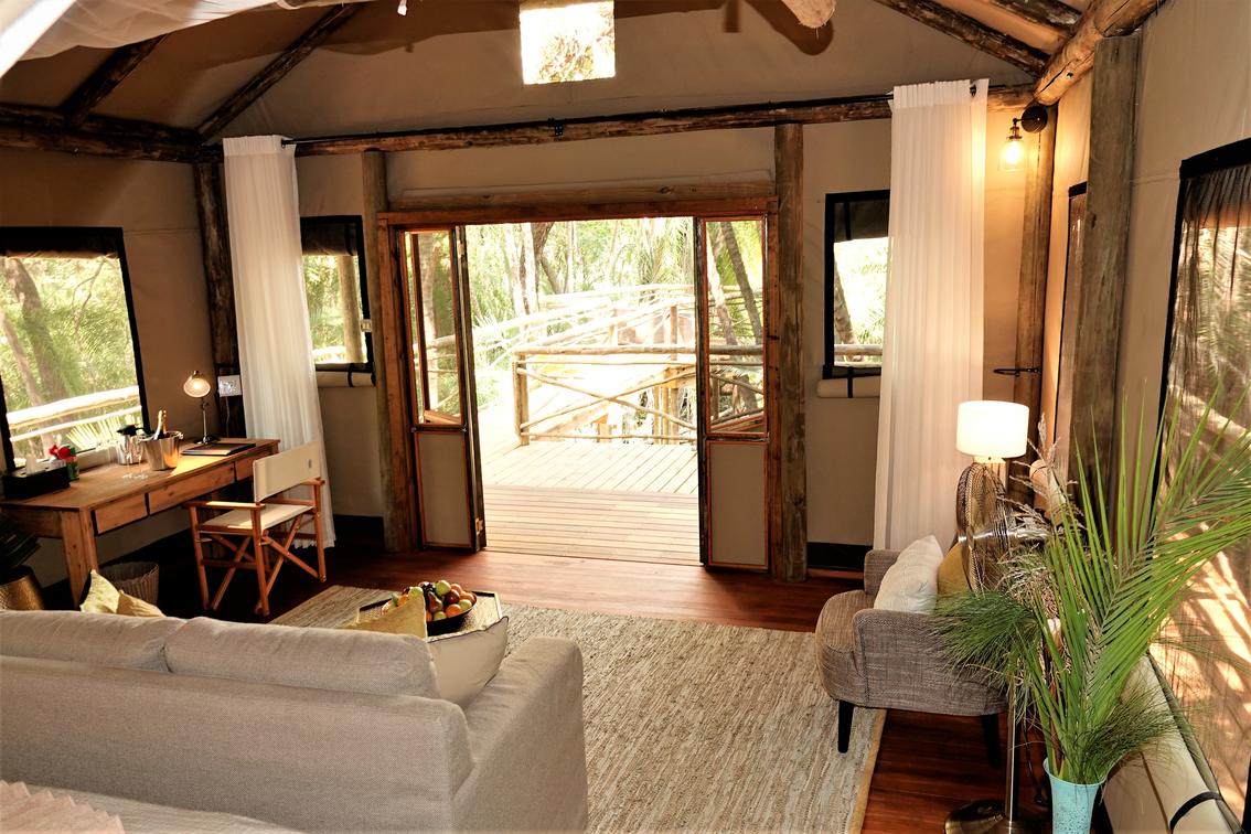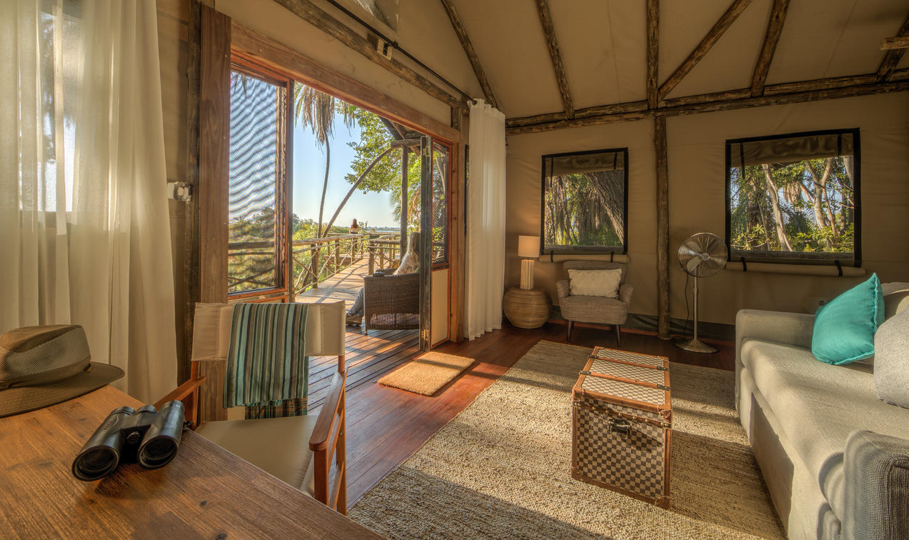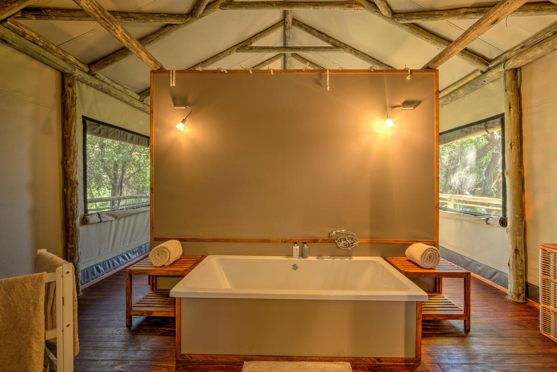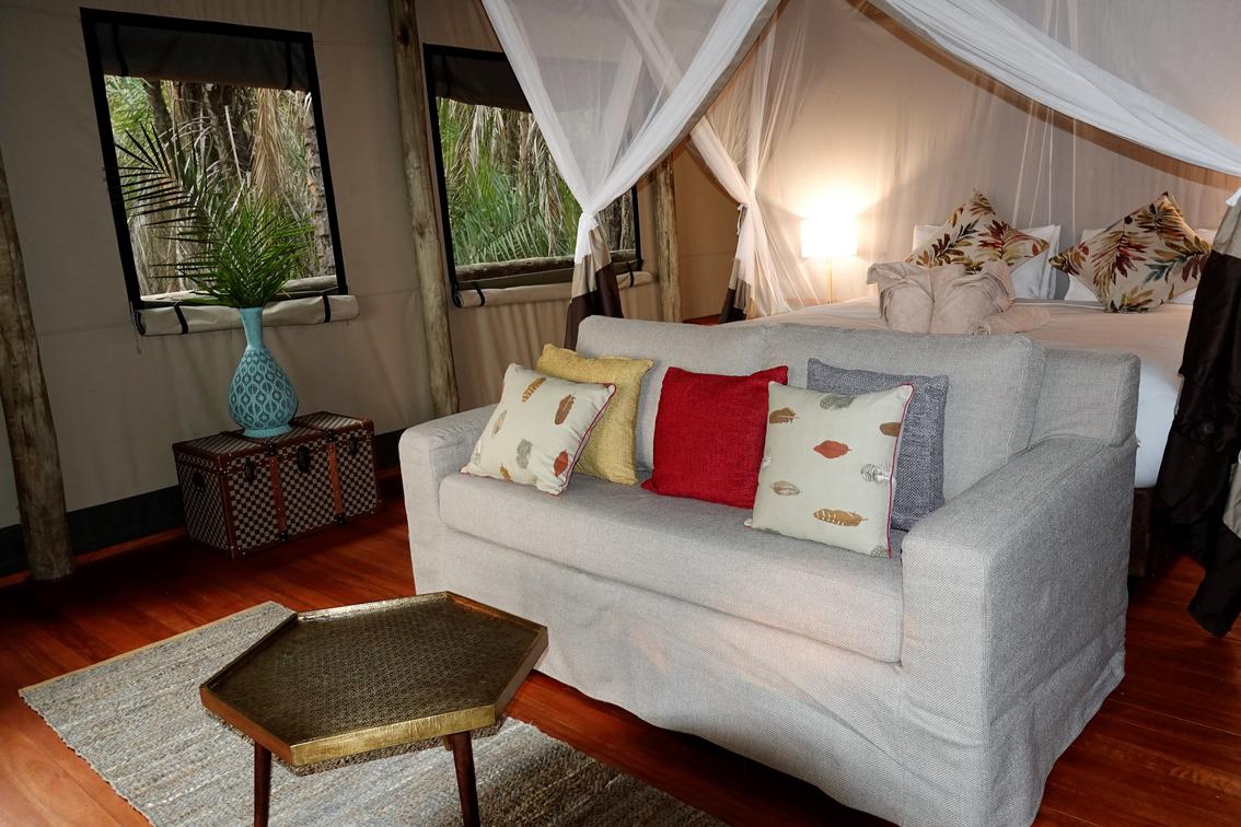 There are 8 standard light and airy tented 'suites'. Each of the tents are elevated on stilts and accessed via wooden walkways and private decks with superb views from which to watch the sunset with a G & T! The tents can all be made into doubles or twins and have comfy sofas, fan, mosquito net, armchairs, safes, desks and en-suite bathrooms. Each bathroom has a free-standing bath, shower, loo and outside shower-with-a-view. The beds are all extra length and when made into a double, are super king size.