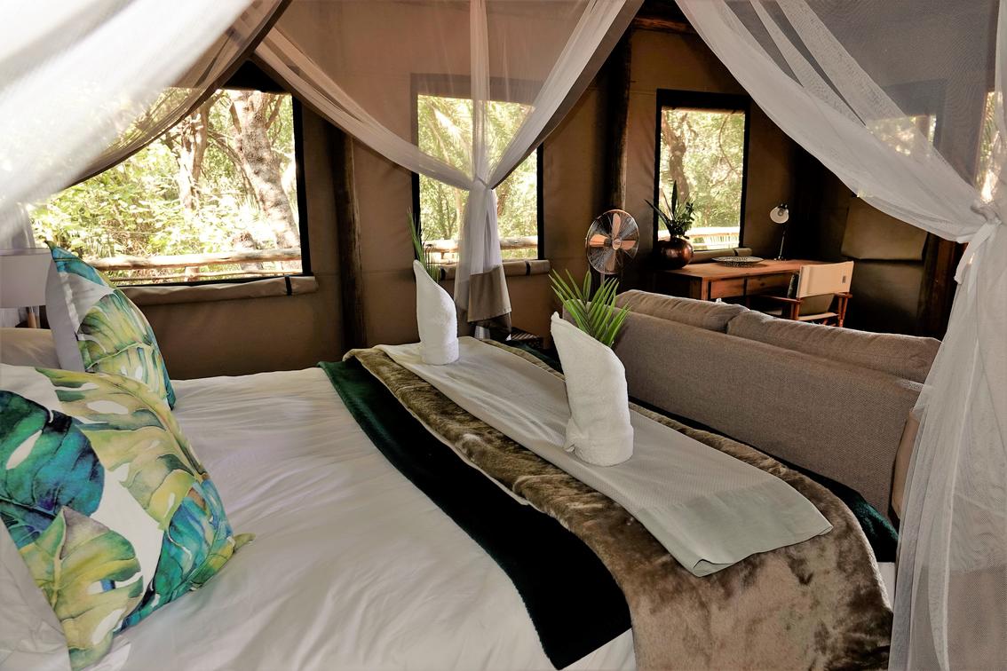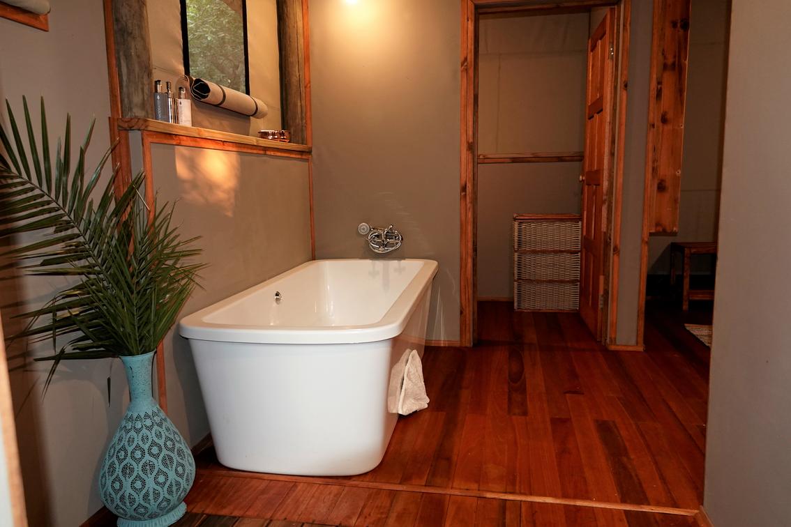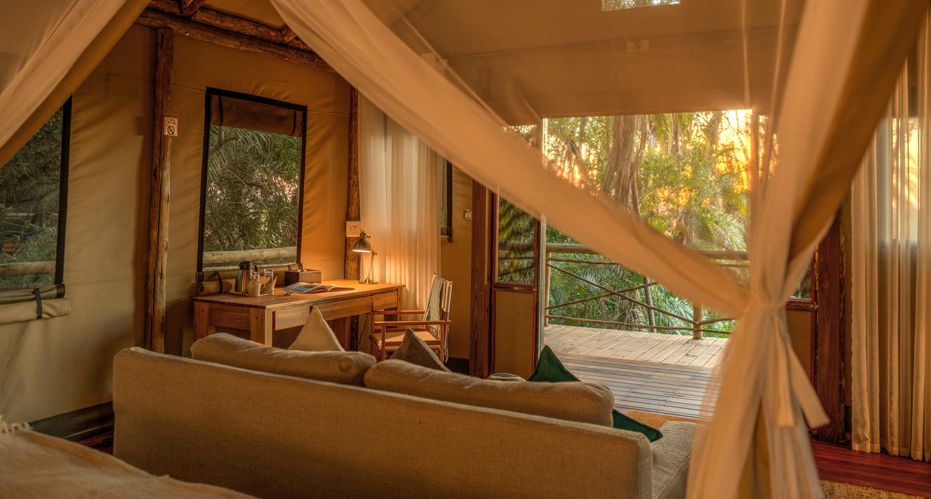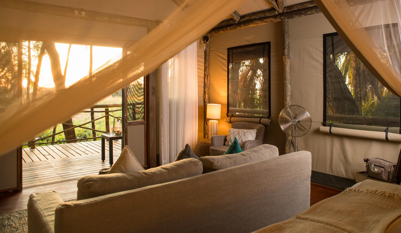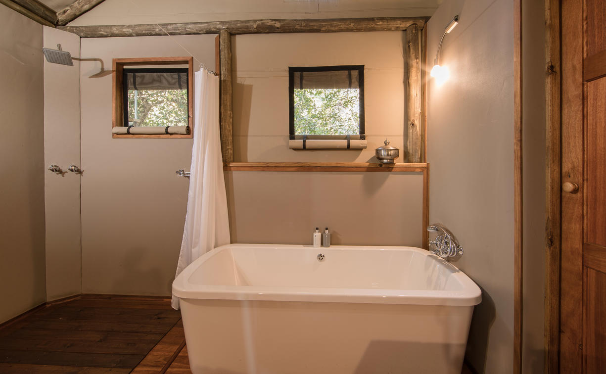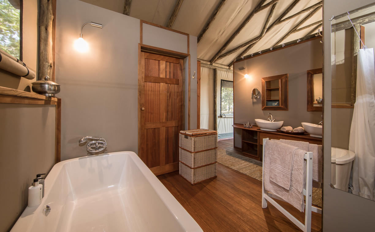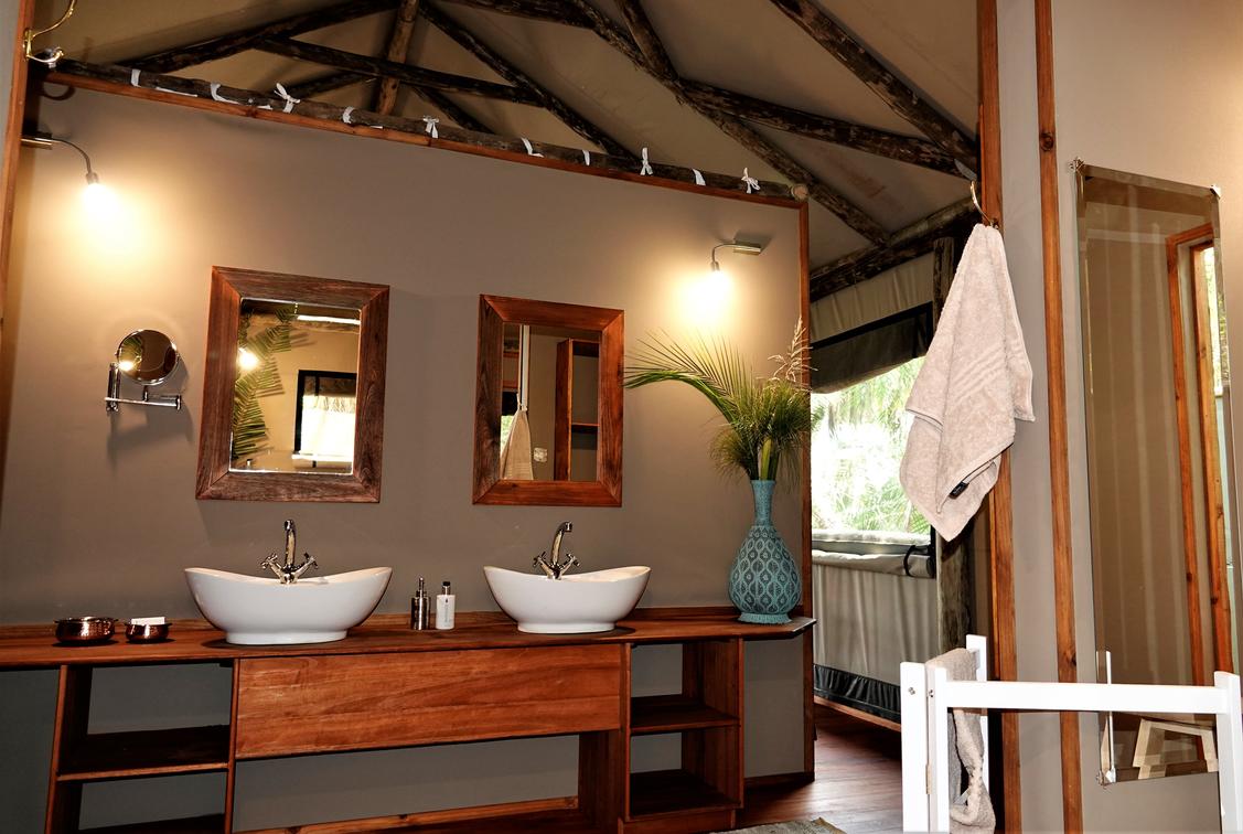 There are 8 standard light and airy tented 'suites'. Each of the tents are elevated on stilts and accessed via wooden walkways and private decks with superb views from which to watch the sunset with a G & T! The tents can all be made into doubles or twins and have comfy sofas, fan, mosquito net, armchairs, safes, desks and en-suite bathrooms. Each bathroom has a free-standing bath, shower, loo and outside shower-with-a-view. The beds are all extra length and when made into a double, are super king size.