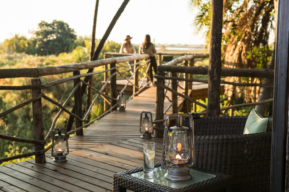 The family tent comprises 2 'standard' tents situated together sharing a massive deck! Each tent has an en-suite bathroom with adjoining outside shower so that mum and dad can keep an eye on the kids but enjoy a little privacy! Both tents can be configured as doubles or singles and each have extra length beds, mosquito net, fan, desk and comfy sofa. The family tent has 2 en-suite bathrooms with free-standing bath, shower, loo and outside shower. There is access between the tents via an interleading door in the outside showers to ensure safety for younger children. There is also a private decking area in between the tents, ideal for private dining. For al fresco private dining, there is a private deck which extends out over the Okavango.
