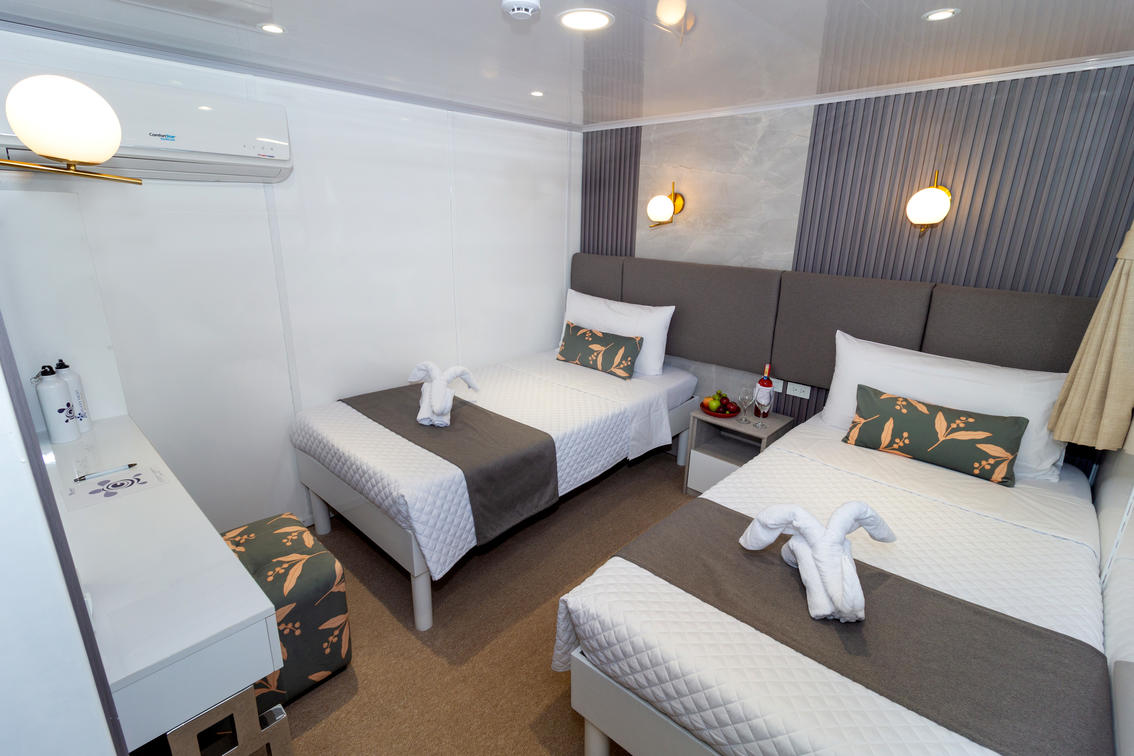 Galaxy has 9 beautiful and comfortable double cabins for 16 passengers; 4 cabins are located in the upper deck, 3 in the main deck and 2 in the lower deck. Each cabin has private facilities: private bathrooms, cold/hot water; air conditioned, hair dryer, telephone for internal communication on board, safe box, and high speaker.