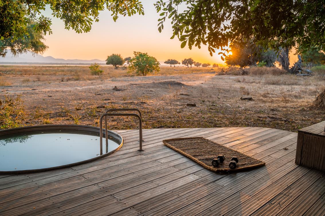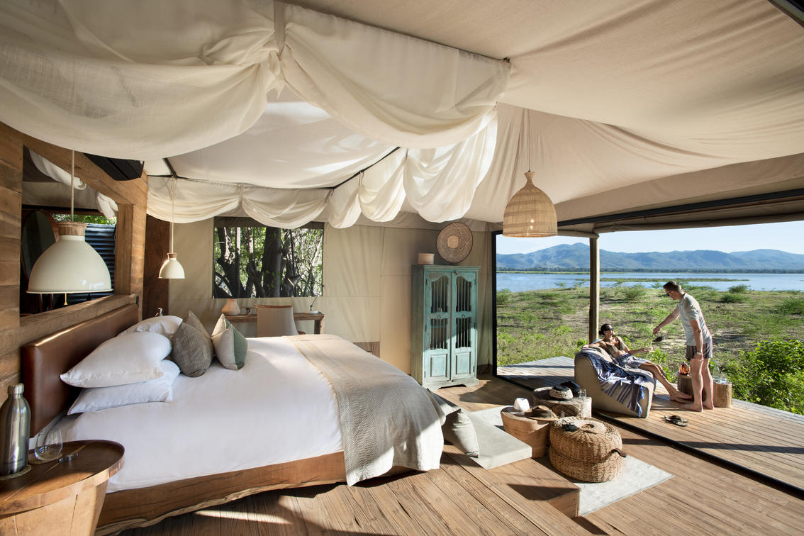 Nyamatusi Camp’s six luxury tented suites are each equipped with air conditioning, an indoor and outdoor shower, a mini bar, a viewing deck with outdoor seating, and a private plunge pool. The suites are adorned with soft drapery, ensuring a serene and elegant ambience, and all boast uninterrupted views of the majestic Zambezi River.