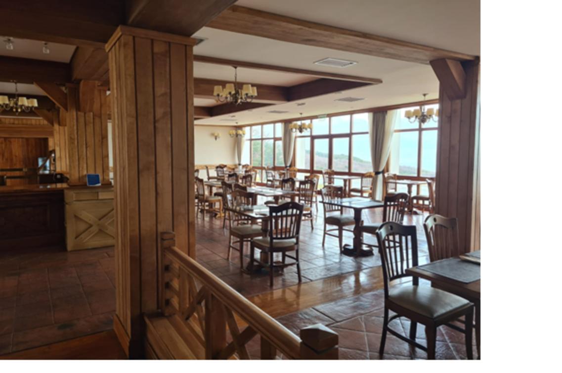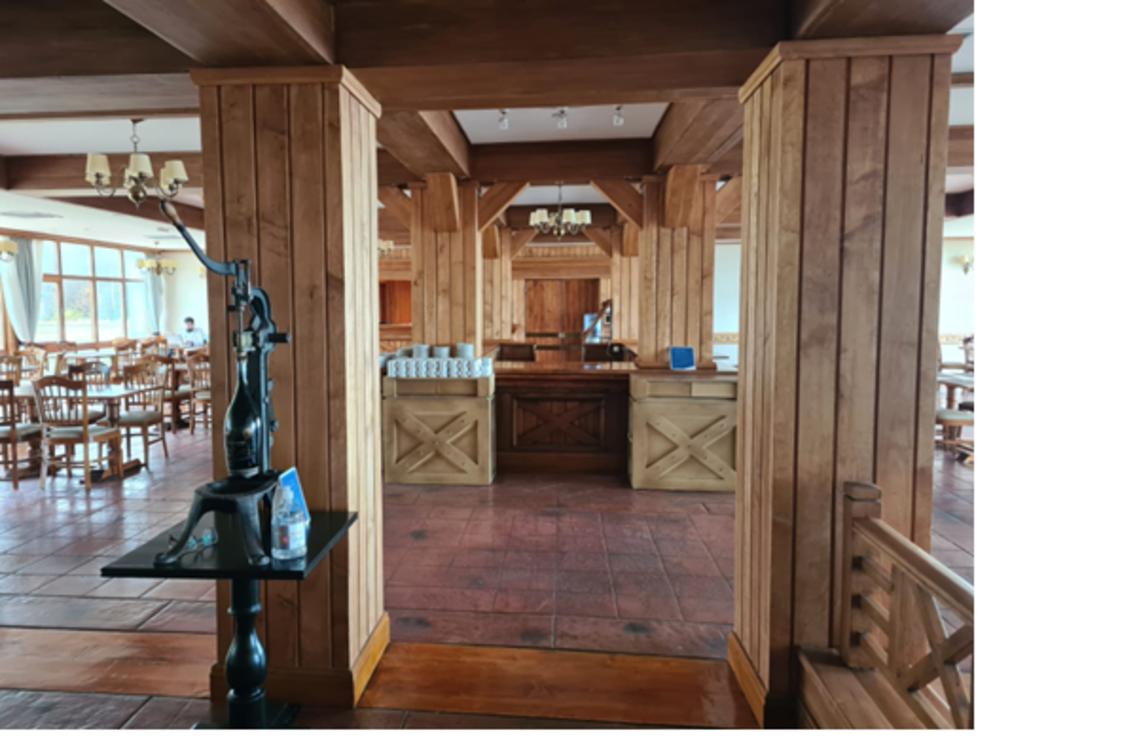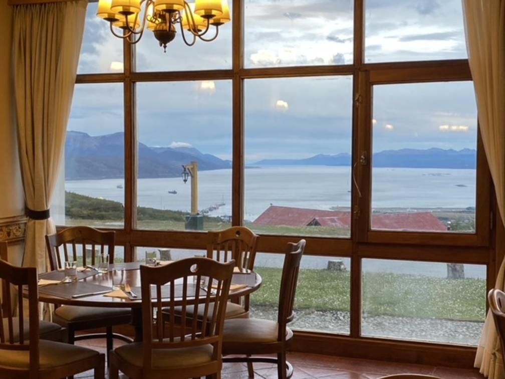 The Temaukel Restaurant has an imposing central island of wood and large windows facing the Bay and the Glacier, tables and chairs made of wood and leather in shades of brown as well as the curtains. Elegant chandeliers and bronze sconces with lampshades that give it a cozy atmosphere.