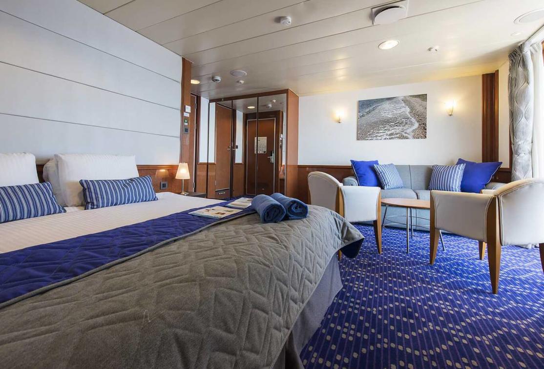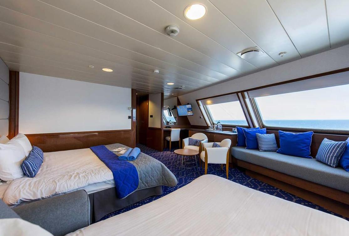 The XD Exterior Cabin can accommodate up to 4 people and offers 2 low beds, third and fourth berths, a bathroom with a shower as well as airconditioning, telephone, hairdryer, safe, TV and refrigerator.