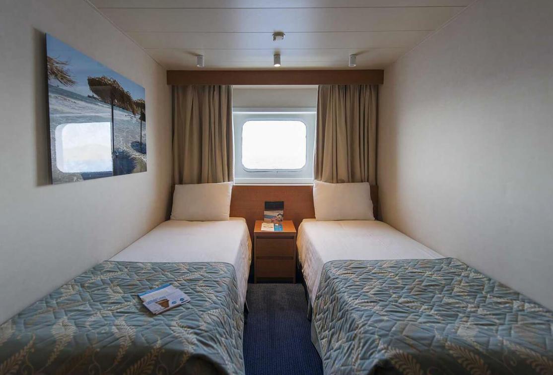 The XF Exterior Cabin can accommodate up to 2 people and offers 2 low beds, a bathroom with a shower as well as airconditioning, telephone, hairdryer, safe, TV and refrigerator.
