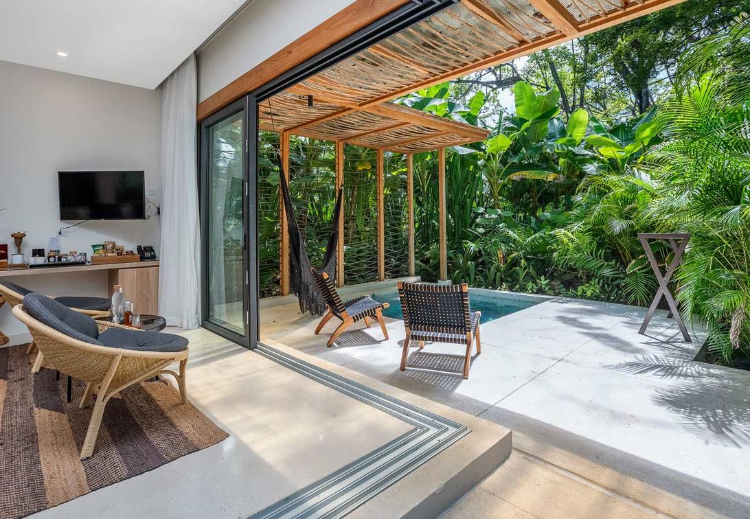 “Manti” is the Chorotegan word for “tree”, and the inspiration behind our sleek units designed to make your private garden and forest experience as vivid as possible. The Manti bungalows are made up of 80 square meters (800 square feet) of luxury space including an ample terrace, a private 3.5 x 3.5 meter (10 x 10 ft) plunge pool, hammock, king bed and double indoor/outdoor shower. Our floor to ceiling glass doors open to garden views, making Manti ideal for a memorable honeymoon or just a romantic getaway surrounded by raw nature and the mystic sound of the forest.