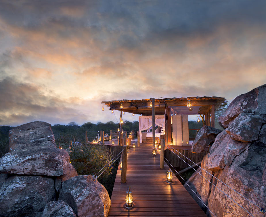 Make your way through rows of magnificent white boulders and across a small drawbridge, and you will find Africa opening up in front if you. Set amid the pure and untouched wild, you will be surrounded by African bush and uninhibited wildlife at its best. The Kingston Treehouse is constructed entirely from wood and glass, with contemporary décor in understated hues of greys, white, black and purple. No matter what the weather has in store, you will have a safe and luxurious setting with a unique window to enjoy the ever-changing views. In fact, we defy you to find two identical African sunsets. The 60m2 Treehouse is situated about 5 minutes from the main lodge, and you will have radio contact with the rangers, should you choose to. You will also find some cellphone reception; but don’t expect any wi-fi in the bush. Kingston is equipped with full bathroom and shower facilities, and Africology products to complete your sensory experience. Enjoy a dinner of tapas or a full meal with Champagne, under the splendor of an African starlit sky.