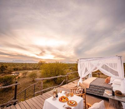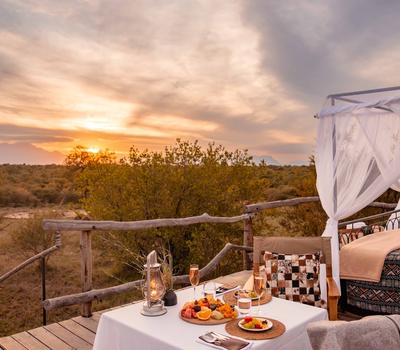 You’ll arrive before sunset to watch the changing colours of evening and sip a sundowner. The African bush fairytale continues with a five-course dinner served to you by a personal chef at an intimate table for two on the platform. Or you can enjoy dinner at the lodge and arrive at your romantic sleep-out venue afterwards. By night, it will be encircled by a ring of golden lantern light.