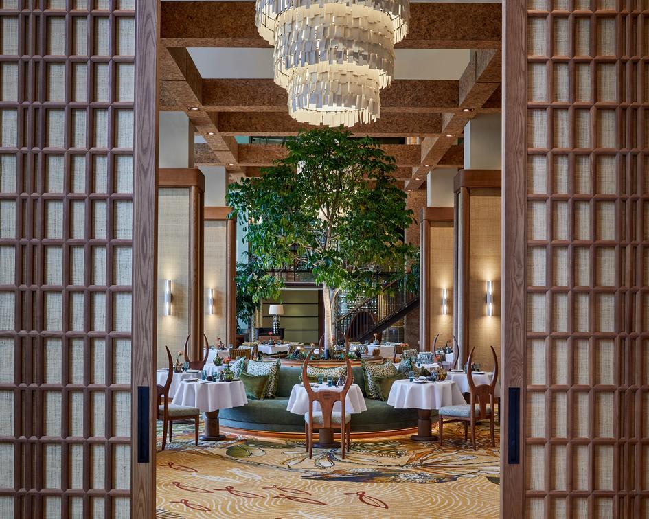 An elegant contemporary space, the setting brings the outside world in with the inclusion of seven living trees and ‘horned’ seats (a nod towards Ankole cattle known for their long horns) to the design scape.