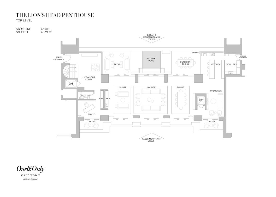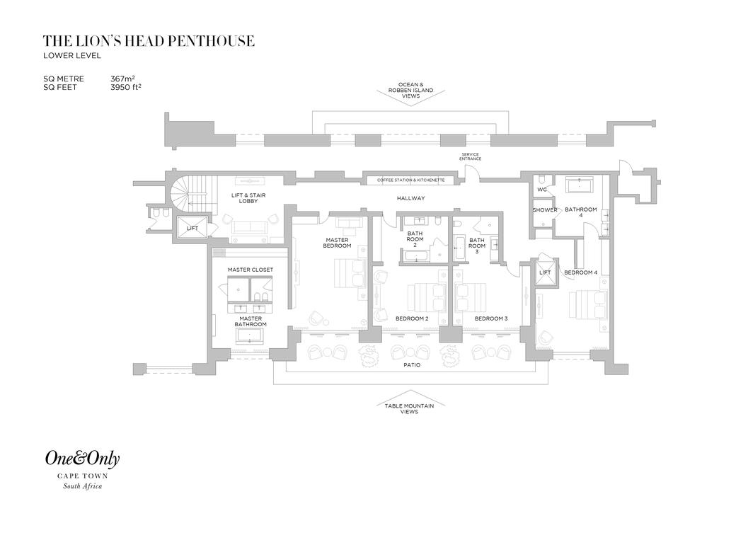 Created with luxury in mind, the 798m² penthouse features four bedrooms with en-suite bathrooms, complete with 3 king beds, 1 room with 2 three quarter beds and awe-inspiring views of Table Mountain. The master bedroom includes a master closet and bathroom, with a rain shower, private water closet and marble vanities.
