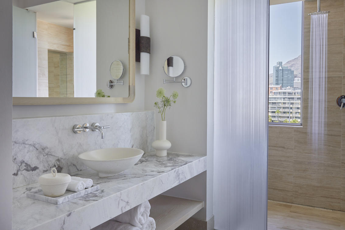 Indulged with every conceivable luxury, the 383m2/4,122ft2 Presidential Suite features two bedrooms complete with king beds and awe-inspiring views of Table Mountain. Warm, neutral fabric imparts a residential feeling and sumptuous pillows provide splashes of colour throughout. The master bedroom includes his-and-hers bathrooms, each with a rain shower private water closet and marble vanities.