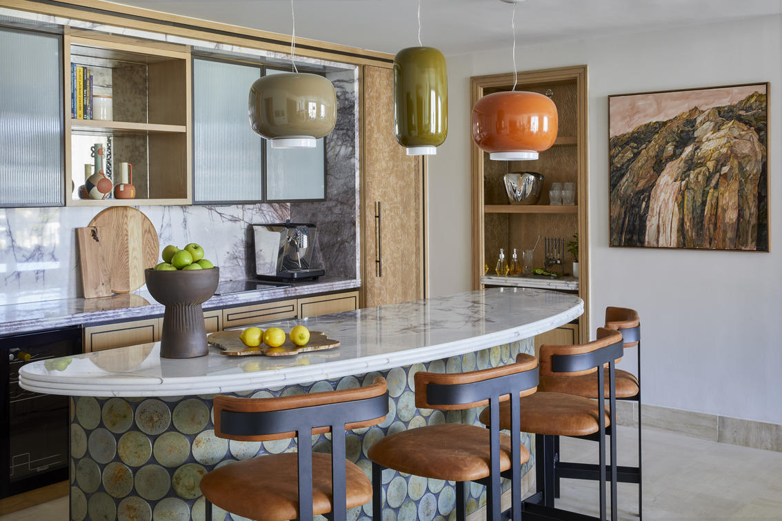 Every element was carefully considered, such as the painstakingly hand-painted dome shaped gemstone depiction piece above the curved headboard of the bed, the handmade ceramics representing the textures and colours of Table Mountain and the beaded pots representative of the vessels carried on the heads of the people of Africa, transporting the lifeblood of earth - water - to their families.