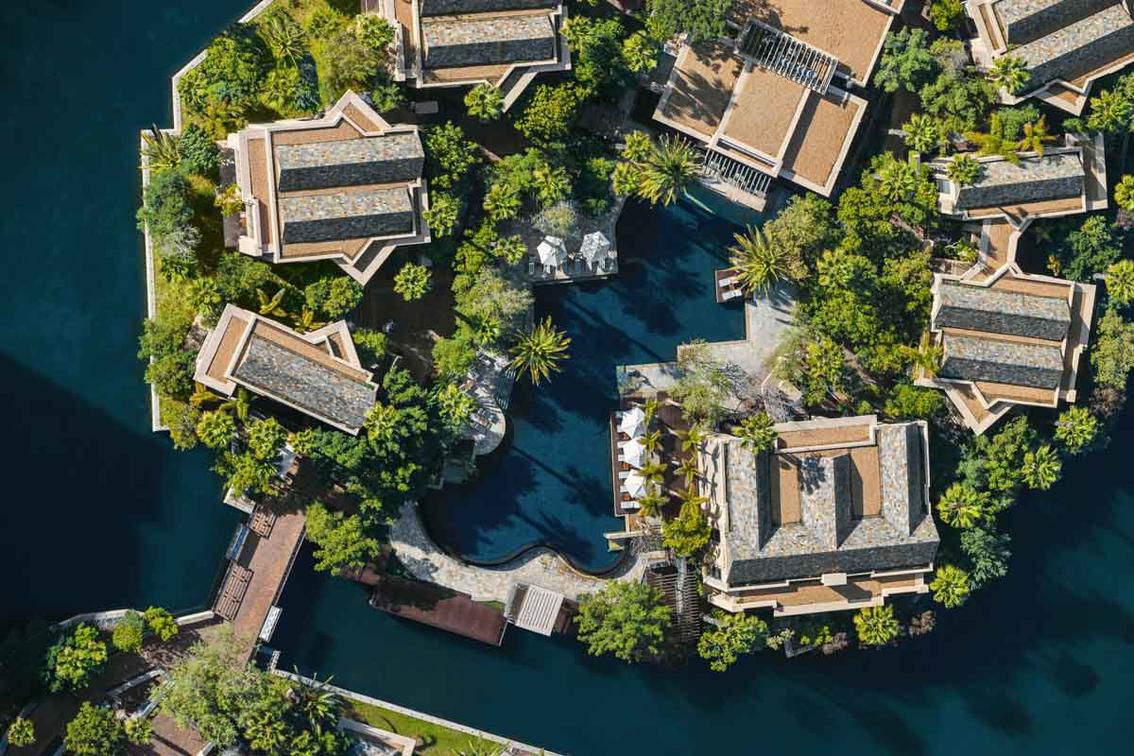 The en-suite bathroom is complete with an opulent oversized bath, a sensational rain shower, private water closet, dual marble vanities and a widespread dressing area. The interior art and design speak directly to the tropical paradise upon which each key can be found, the blues and greens of the waterways playing a role within the matching interiors, whilst cool marble and light wooden floors add to a breezy, modern feel. Floor-to-ceiling windows allow for a striking natural backdrop; an amalgamation of lush leafy greens, sparkling blue lagoons, and pale stone finishes. Exquisite wooden features can be seen throughout the rooms, a perfect pairing of functionality and island oasis aesthetic.