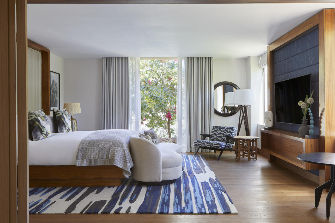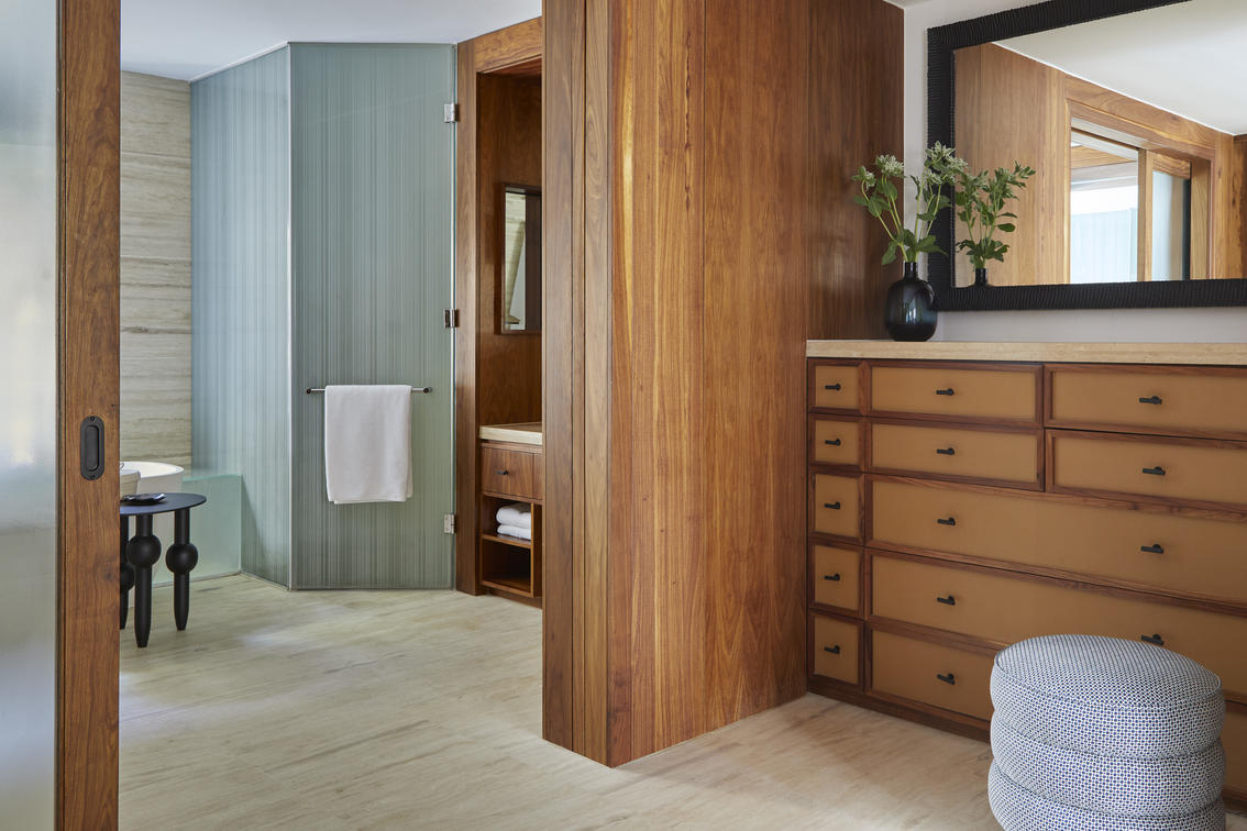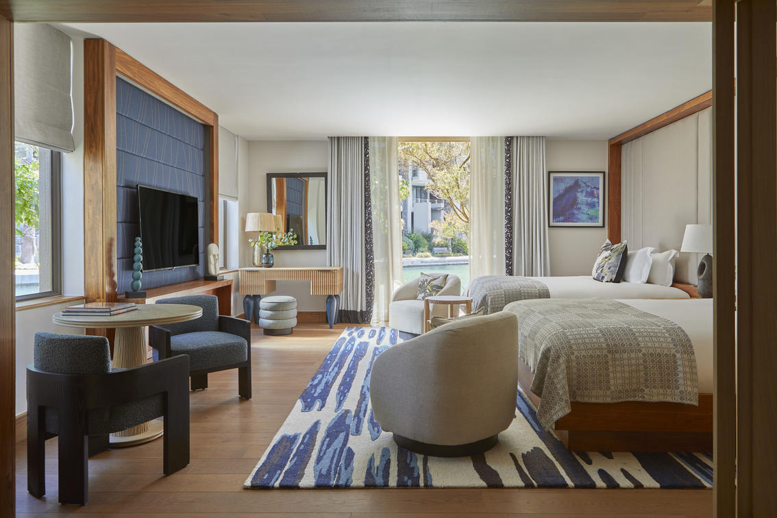 As serene as it is spacious, the family suite boasts two wonderfully tranquil bedrooms as well as three bathrooms in total. Each bedroom has an en-suite bathroom, complete with an opulent oversized luxury bath, a sensational rain shower, private water closet, dual marble vanities and a widespread dressing area. The interior art and design speak directly to the tropical paradise upon which each key can be found, the blues and greens of the waterways playing a role within the matching interiors, whilst cool marble and light wooden floors add to a breezy, modern feel. Floor-to-ceiling windows allow for a striking natural backdrop; an amalgamation of lush leafy greens, sparkling blue lagoons, and pale stone finishes. Exquisite wooden features can be seen throughout the rooms, a perfect pairing of functionality and island oasis aesthetic.