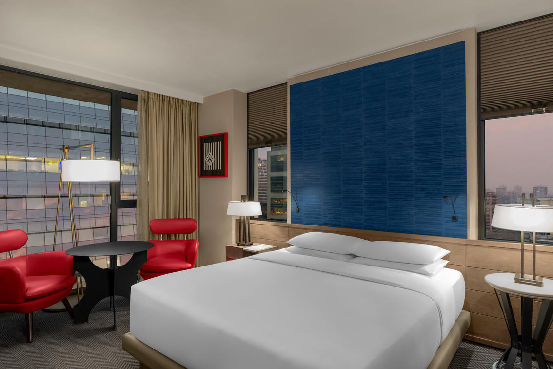These upper level rooms stretch from 29 to 31 square meters and offer a great view to the Andes mountain or the skyline thanks to the floor-to-ceiling windows. Enjoy one king bed, a sofa and a modern bathroom with rain shower.