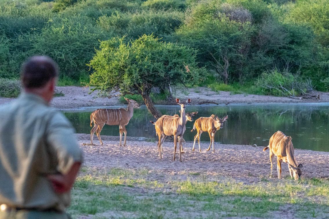 Our approach centres on active and responsible breeding management. By relocating dominant bulls when necessary and introducing new bloodlines, we maintain strong genetic diversity while reducing conflict within the herd. During the dry season, from May to November, when natural grazing becomes limited, we provide supplementary feeding to keep the herd in optimal condition. This also creates exceptional viewing opportunities, as rhinos are regularly drawn to the lodge waterhole—allowing for relaxed, up-close sightings right from the comfort of the lodge.