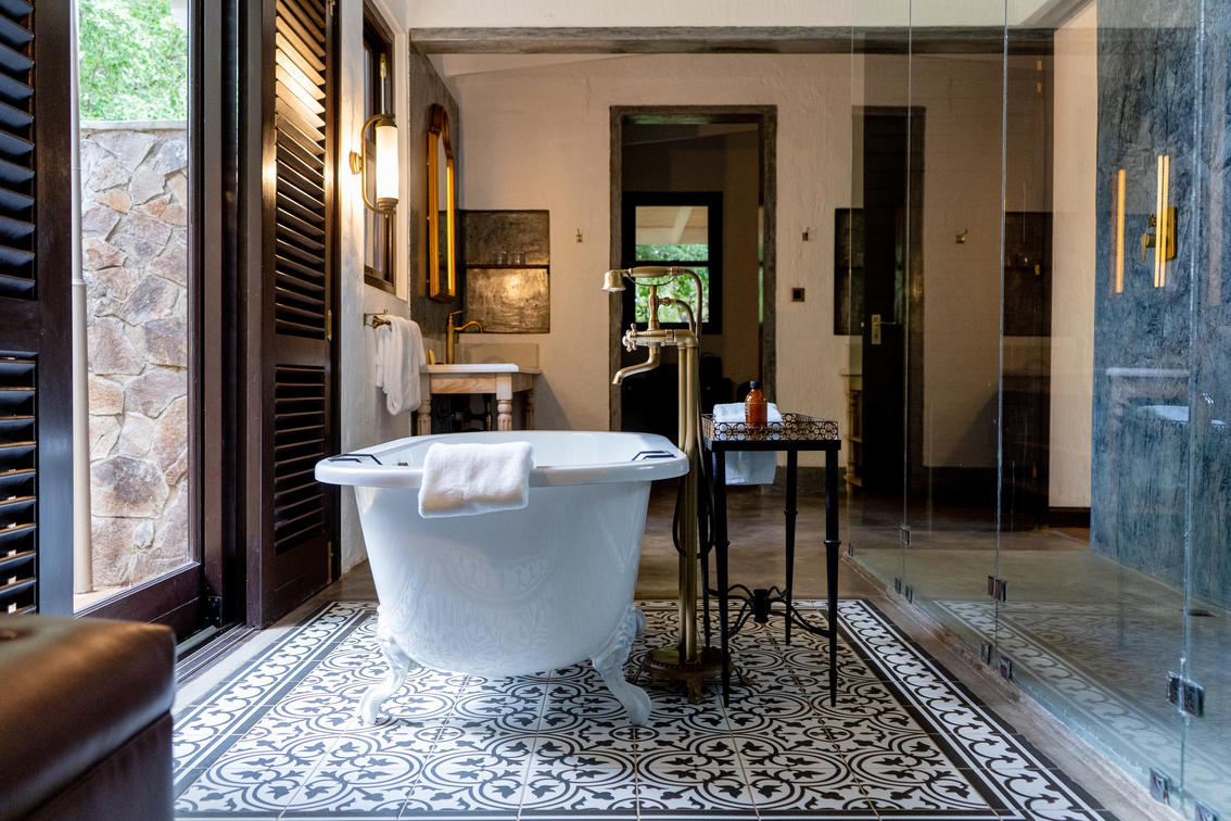 A double-volume bathroom suite features exclusive his and hers couples amenities, a claw-bath and two indoor showers.