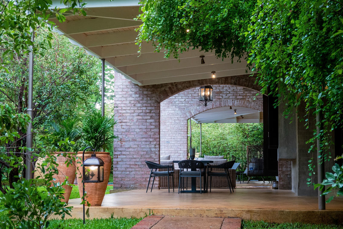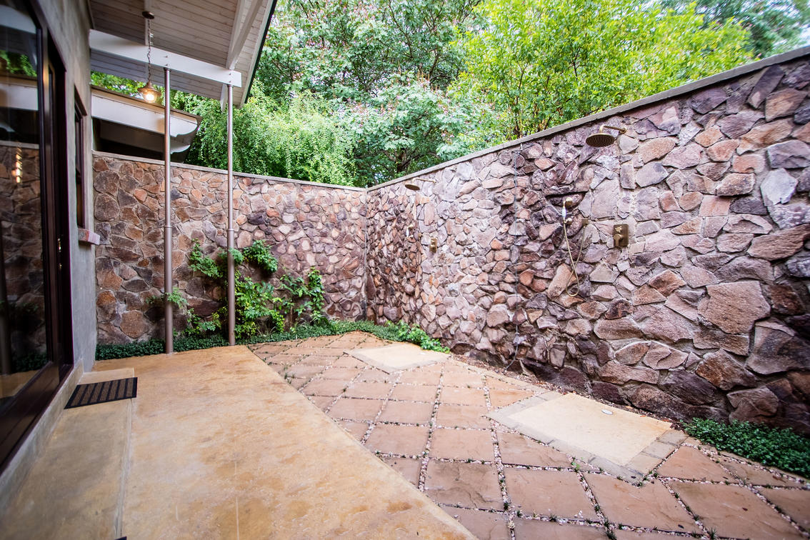 A large private courtyard hosts two outdoor showers and serene space under the trees.