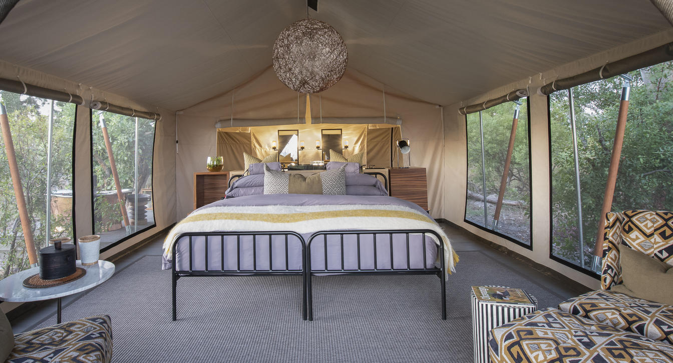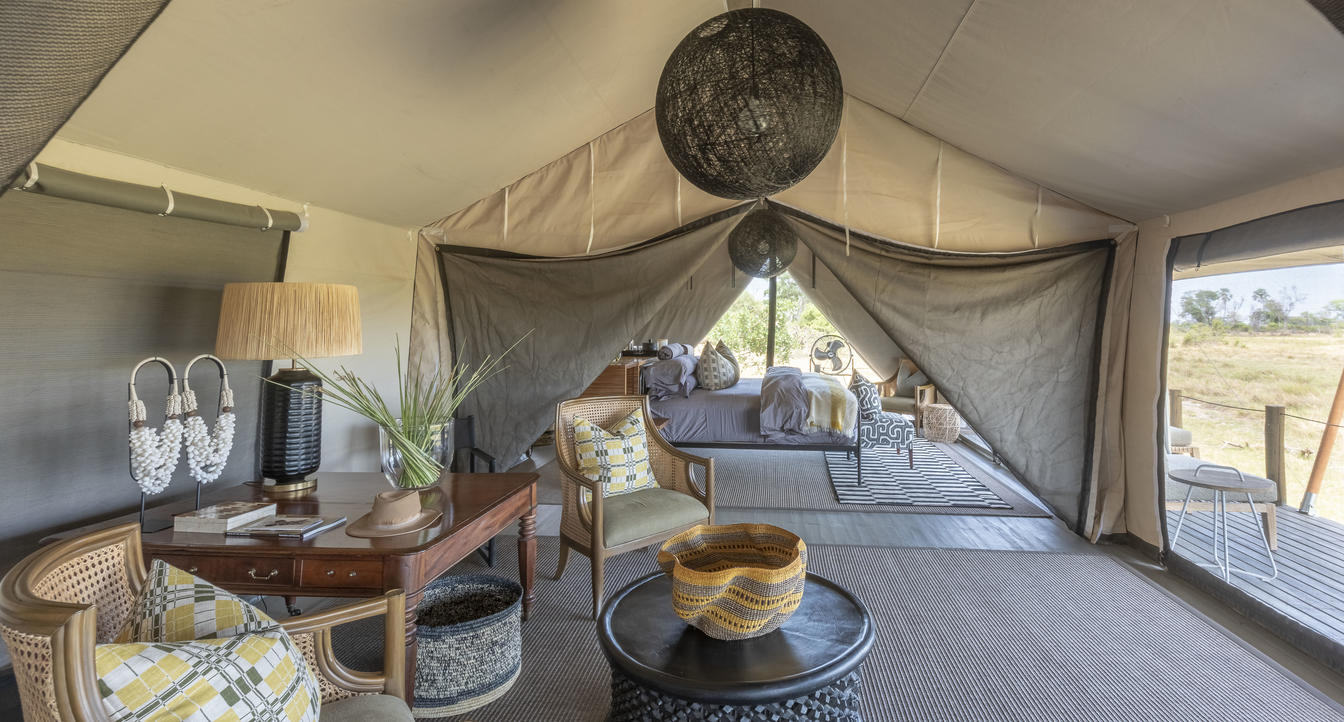 The tents are decorated in a classic safari style incorporating the land and water of the Okavango delta which make up this beautiful land. Luxurious, comfortable, classic. All rooms have hot and cold running water, inside and outside showers, flush toilets and twin his and her basins. Electricity in the tents is reserved for lighting and charging of batteries, computers.